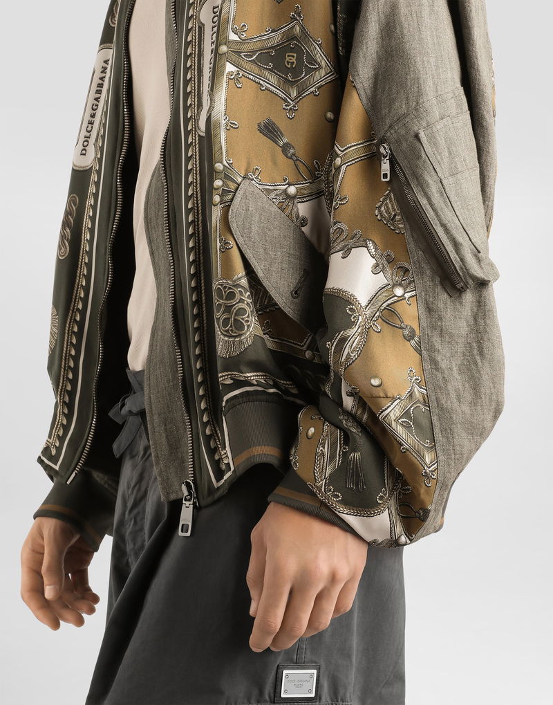Cargo-print twill bomber jacket: Multi-colored Oversized fit V-neck Zip closure Knitted neckline, cuffs and bottom The model is 185 cm tall and wears size 48 Made in Italy The difference in the print placement that you may find on this product is a feature of Dolce & Gabbana’s “Handmade” pieces. A detail that makes every garment or accessory unique and exclusive.