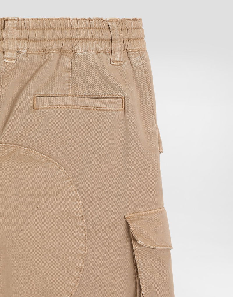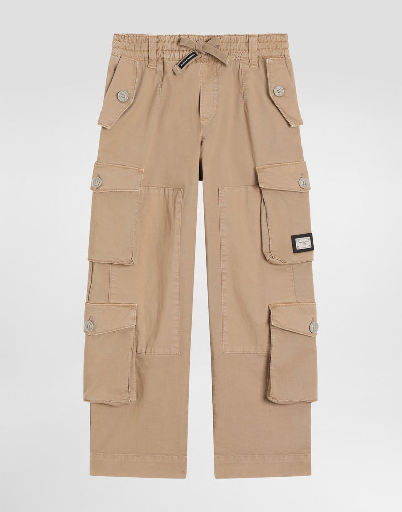 Cargo trousers: Multi-colored Oversized fit Elasticated waistband Front French flap pockets Back pockets with single thread Buttoned flap patch pockets Patterned patches on the front leg and center back.