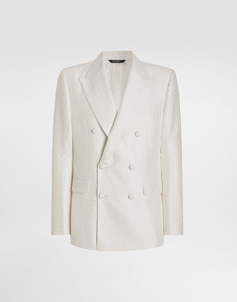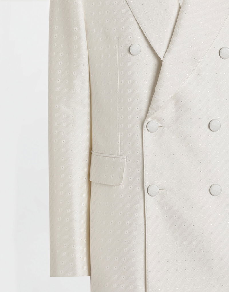Double-breasted jacket with micro pattern jacquard: White Sicilia Light shape Rounded lapels Canvassed and lined Center back length 73.5 cm on size 48 IT The model is 185 cm tall and wears a size 48 IT Made in Italy