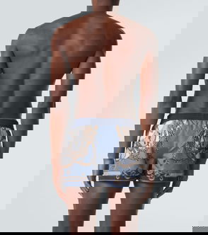 Mid-length leopard-print light nylon swim trunks with metal Dolce & Gabbana branded tag.