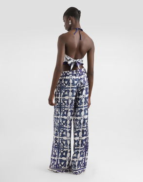 Peony-print silk vanity trousers: Multi-colored Waist with 5 cm high fabric belt and internal elastic Fabric belt with internal elastic Concealed side pockets Hip length 109 cm without belt on size 40 IT Made in Italy The difference in the print placement that you may find on this product is a feature of Dolce & Gabbana’s “Handmade” pieces. A detail that makes every garment or accessory unique and exclusive.