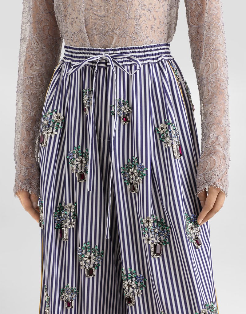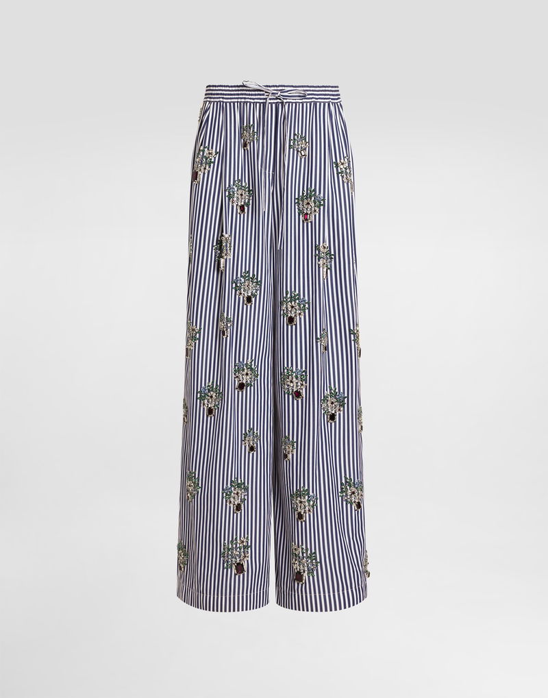 Poplin trousers with Crystal Flower embroidery: Multi-colored Two front pleats on each side Elastic waistband with matching fabric drawstring Front French pockets Back patch pocket Mock front fastening Contrast piping on the sides, front pocket opening, and back pocket edge.