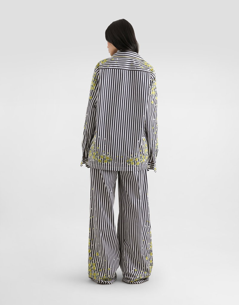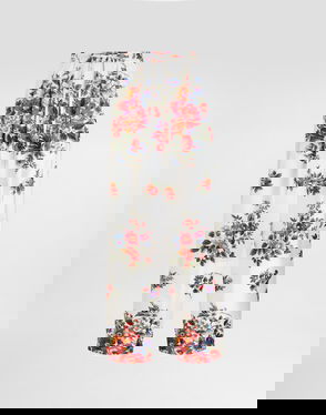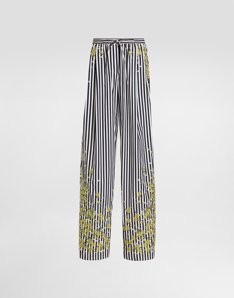 Poplin trousers with Floral embroidery: Multi-colored Low waist Waistband with internal elastic and matching fabric drawstring Front two pleats at the waist on each side Fake lacing in the center front French pockets Back pocket applied Contrast piping in the sides, on front pocket opening and back pocket edge Leg opening 32 cm on size 40 IT Inseam length 84 cm on size 40 IT The model is 175 cm tall and wears size 40 IT Made in Italy Relaxed fit. Consider taking a size smaller if you prefer a tighter fit.