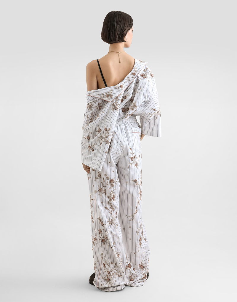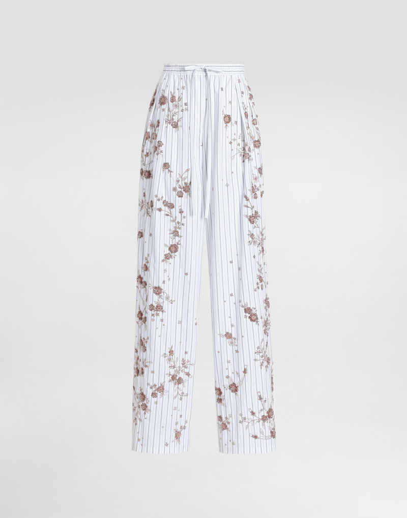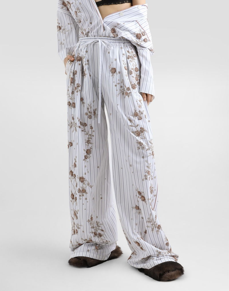Poplin trousers with thread floral embroidery and rhinestones: Multi-colored Low waist Two front pleats on each side Elastic waistband with matching fabric drawstring Front French pockets Back patch pocket Mock front fastening Contrast piping on the sides, front pocket opening, and back pocket edge Inseam length 84 cm on size 40 IT Leg opening 32 cm on size 40 IT The model is 175 cm tall and wears size 40 IT Made in Italy Relaxed fit. Consider taking a size smaller if you prefer a tighter fit.