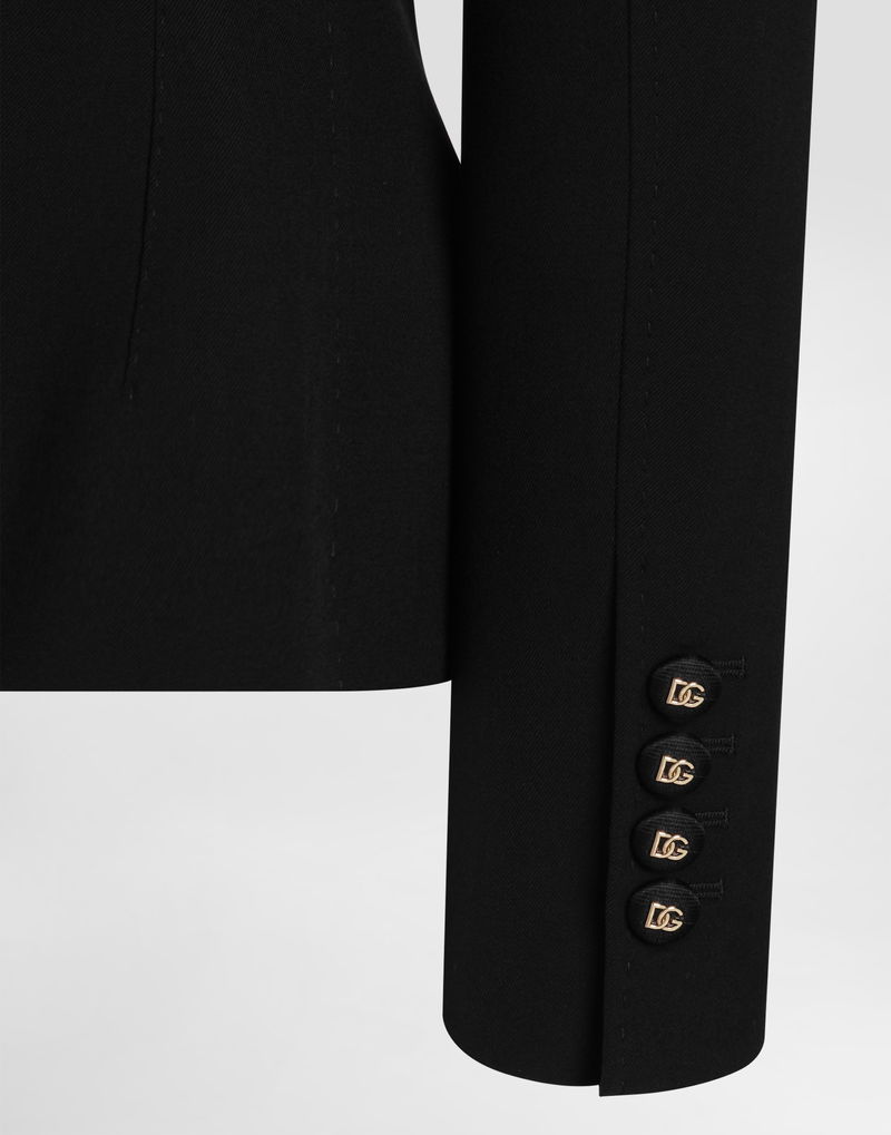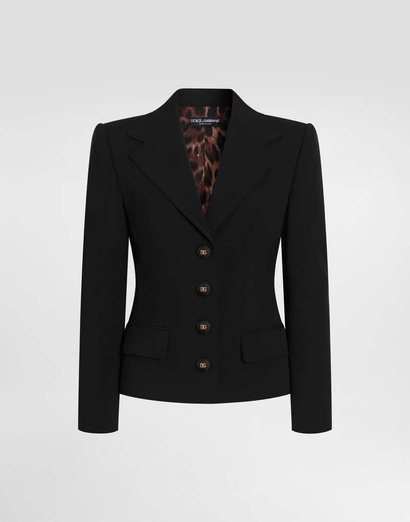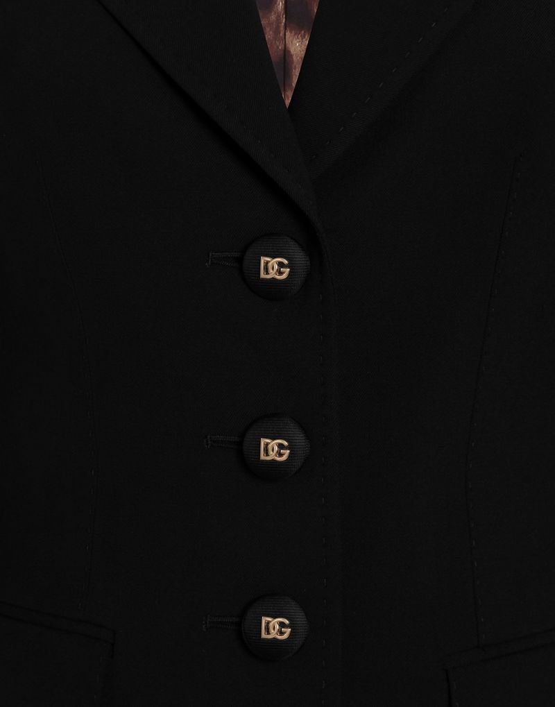 Single-breasted jacket: Black Dolce shape lined, canvassed Notched lapels Front and sleeves with buttons Squeezed waist with darts Lined and canvassed.