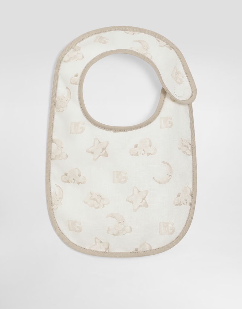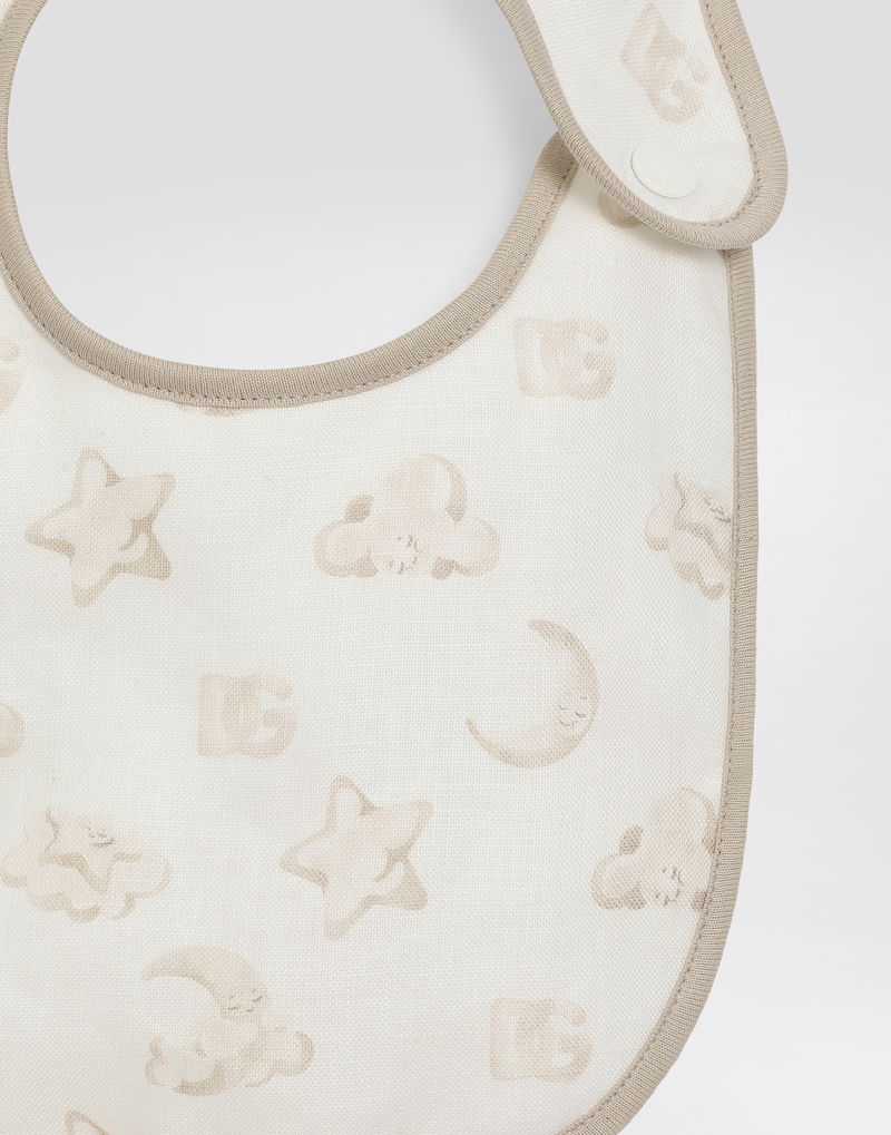 Linen fabric bib with moon and stars print: White Small concealed press-stud fastening on the side Terry cloth lining All-over print. The difference in the print placement that you may find on this product is a feature of Dolce & Gabbana’s “Handmade” pieces. A detail that makes every garment or accessory unique and exclusive.