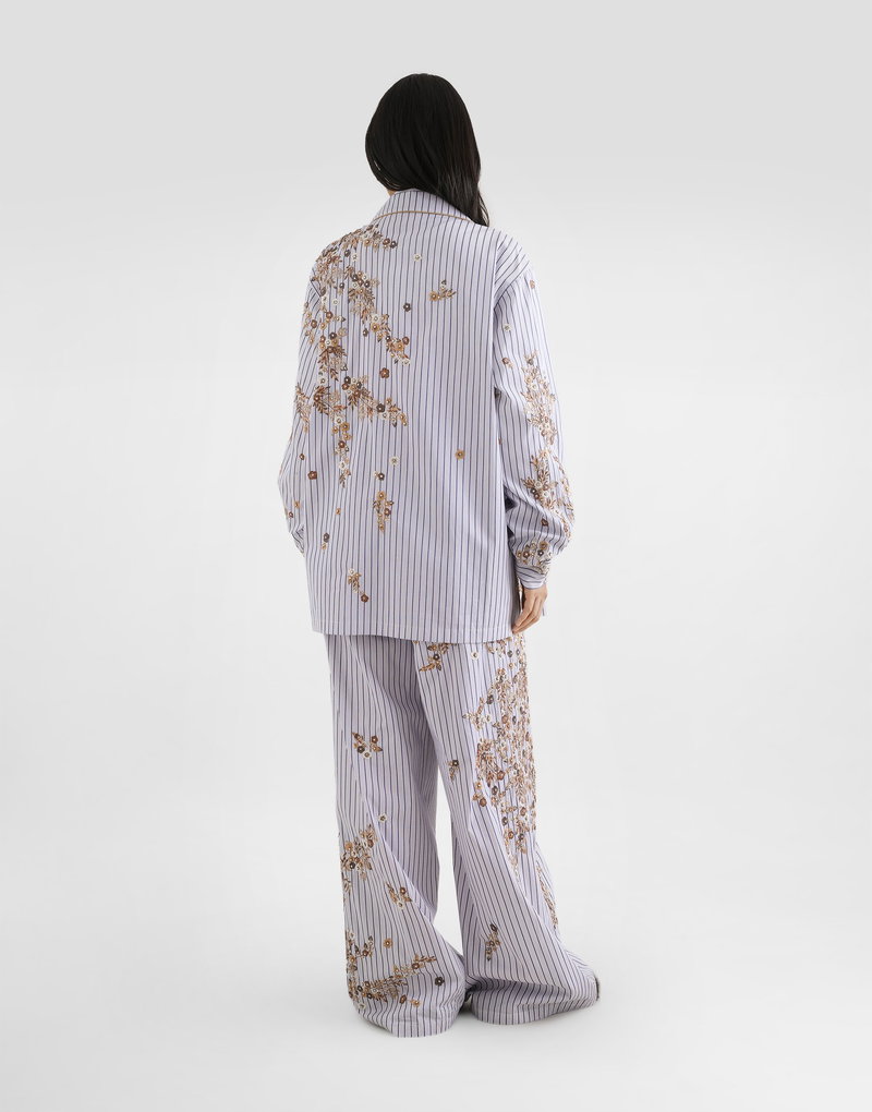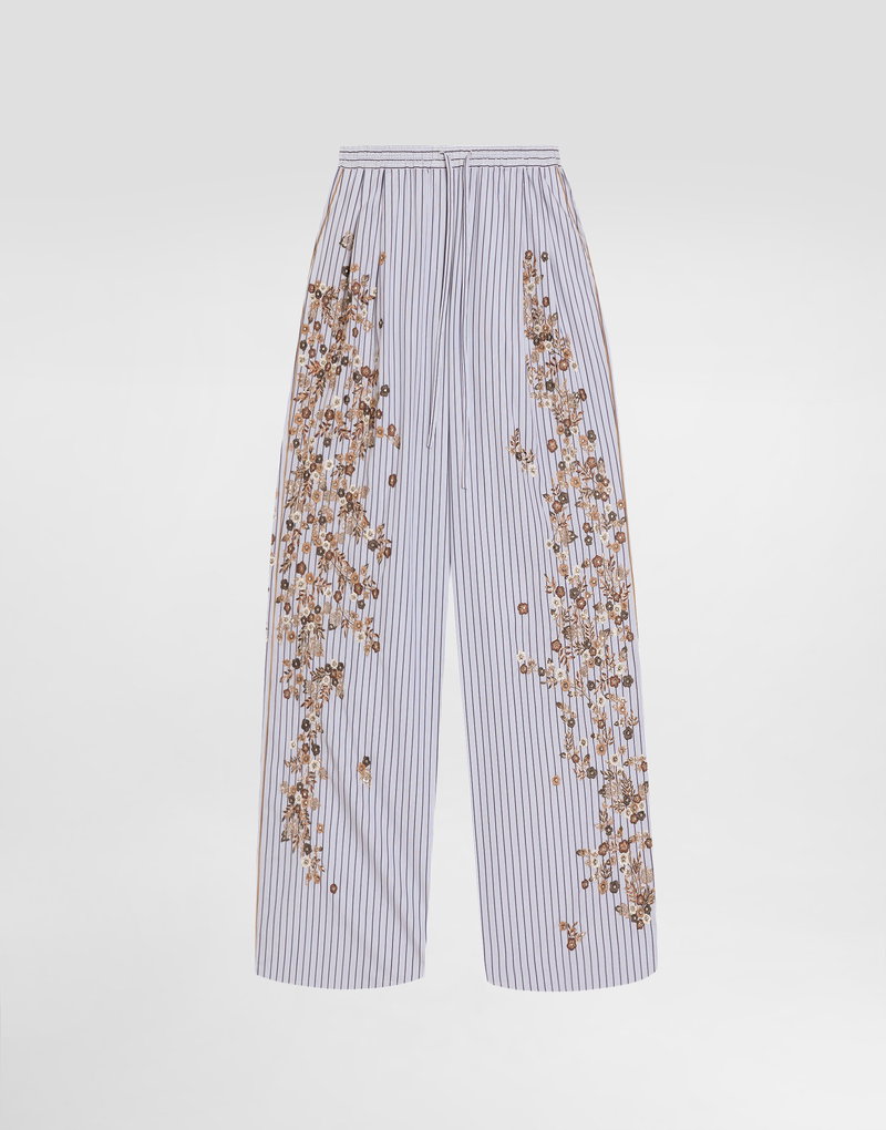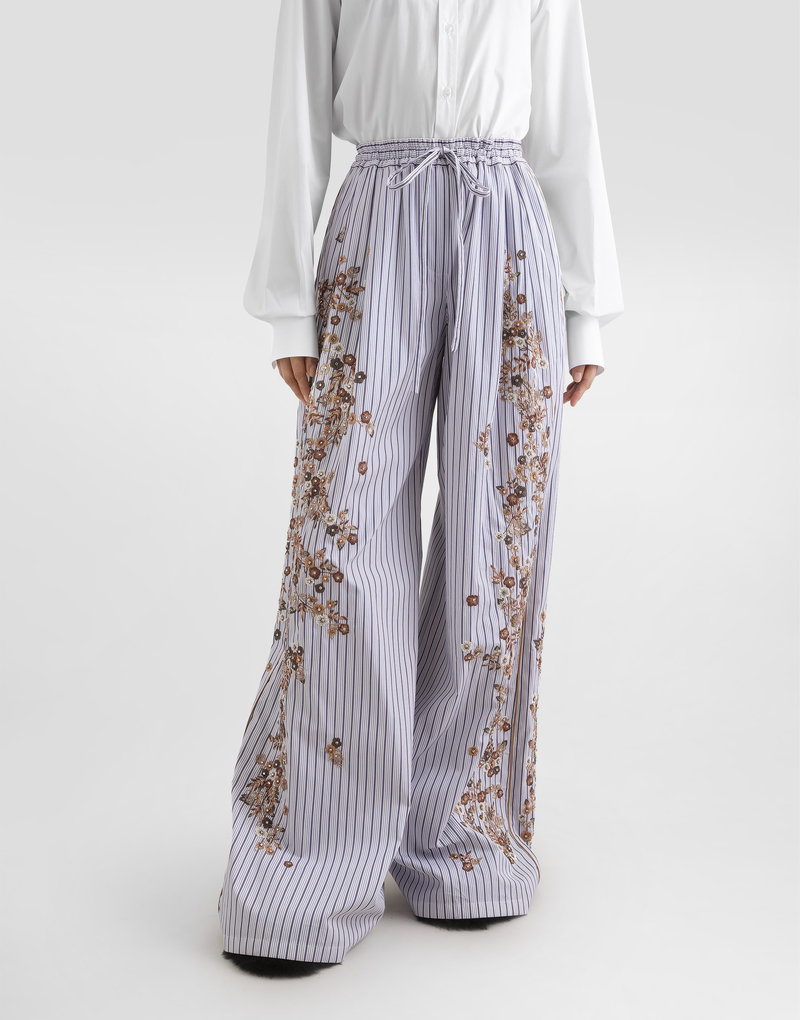 Striped poplin trousers with flower embroidery: Multi-colored Low waist Waistband with internal elastic and matching fabric drawstring Front two pleats at the waist on each side Fake lacing in the center front French pockets Back pocket applied Contrast piping in the sides, on front pocket opening and back pocket edge Leg opening 40 cm on size 40 IT Inseam length 84 cm on size 40 IT The model is 175 cm tall and wears size 40 IT Made in Italy Relaxed fit. Consider taking a size smaller if you prefer a tighter fit.