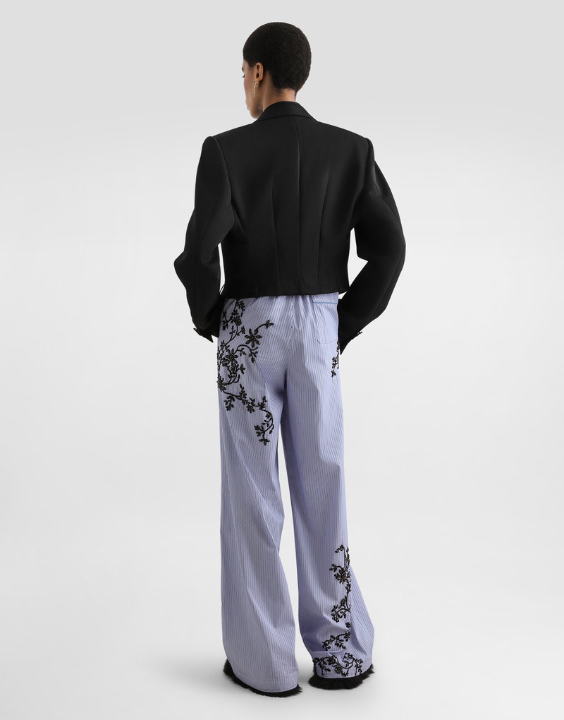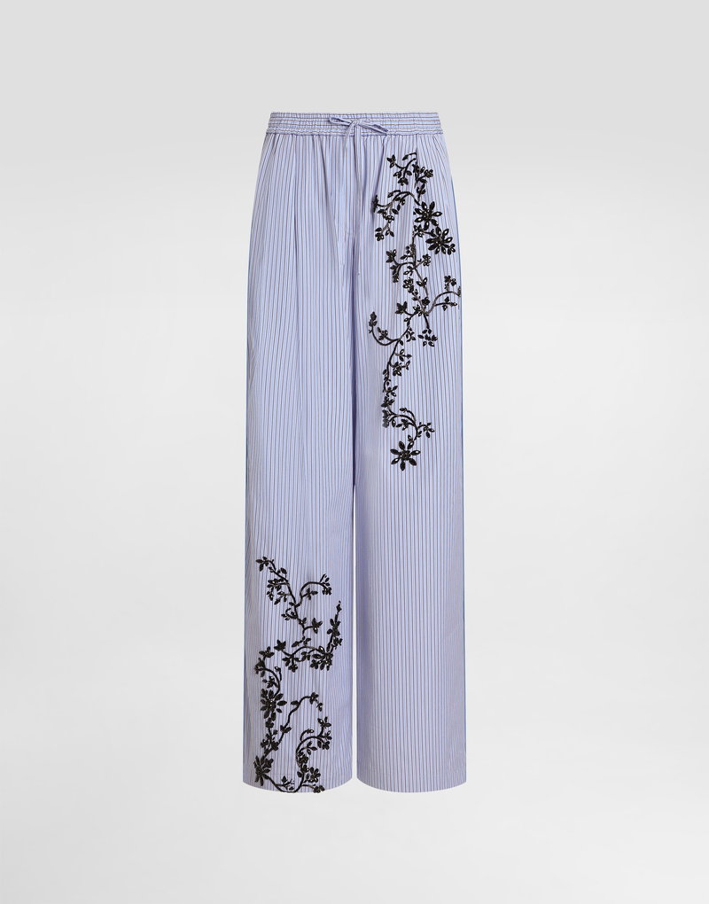 Striped poplin trousers with flowers embroidery: Multi-colored Low waist Waistband with internal elastic and matching fabric drawstring Front two pleats at the waist on each side Fake lacing in the center front French pockets Back pocket applied Contrast piping in the sides, on front pocket opening and back pocket edge.