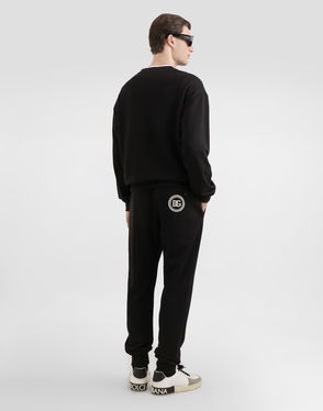 Treated jersey trousers: Blue Elastic belt and internal drawstring Hip pockets Back pocket with covered zip Patch on the back The model is 185 cm tall and wears a size 48 IT Made in Italy