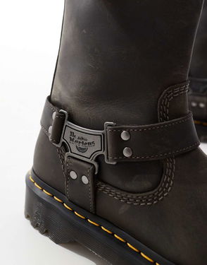 AirWair pull tab for easy entry. Pull-on style. Signature Dr Martens branding. Round toe. Chunky sole. Lugged tread.