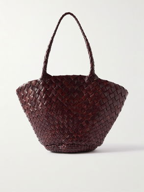 Dragon Diffusion's Egola line channels traditional basket weaving techniques into uniquely modern accessories, emblematically defined by irregularly woven leather strips. This smaller iteration has a versatile open top design that's ideal for all seasons, even offering a sneak peek at the antiqued St. Christopher medal charm sewn into its lining.
