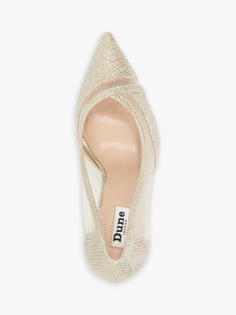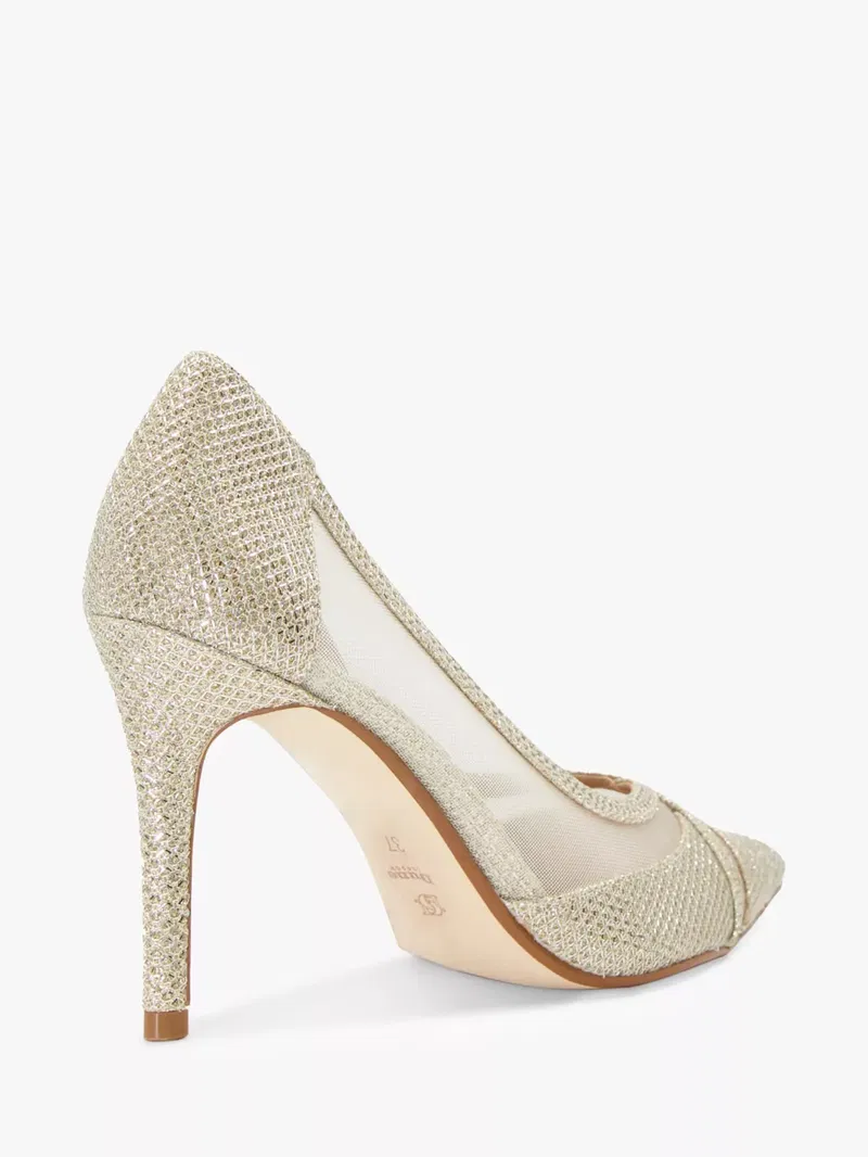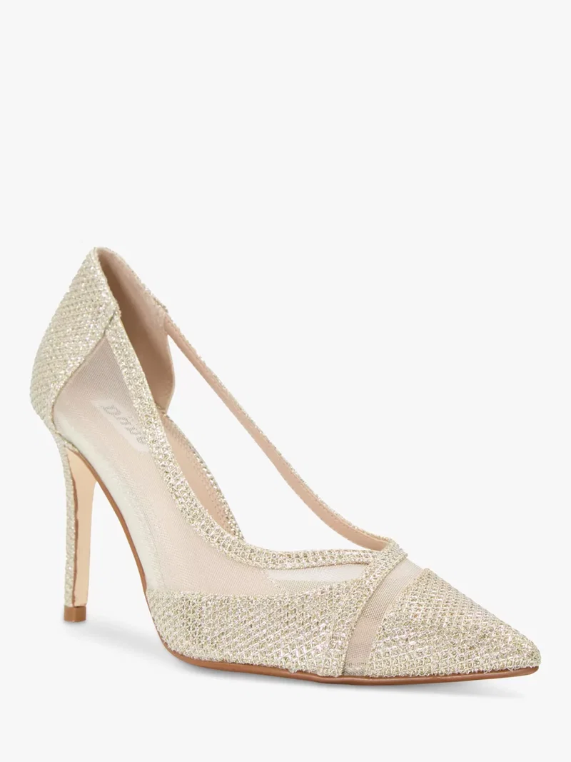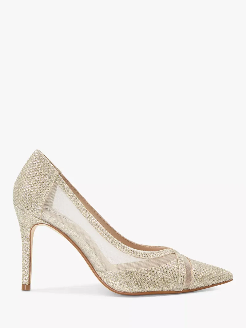 The ultimate in stalwart style, this pair of courts from Dune is made with metallic and sheer mesh panel uppers. Set on a stiletto heel, they are finished with a pointed toe that elongates the profile.