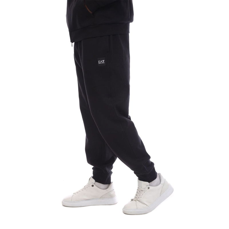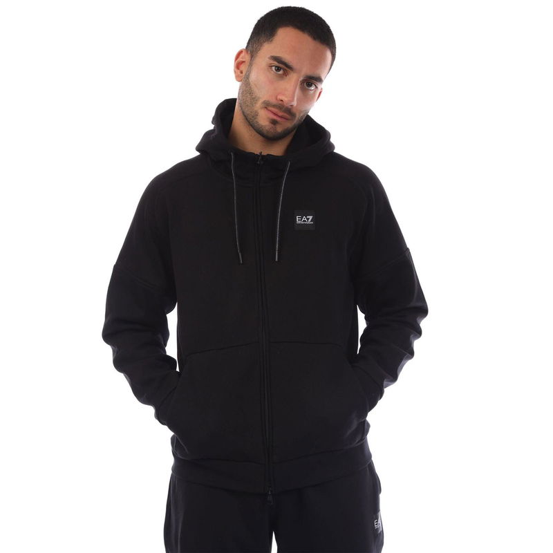 Mens Emporio Armani EA7 Box Logo Zip Hooded Tracksuit in black. Hoodie: Adjustable drawstring hood. Open pockets. Full zip fastening. Elasticated trims. Small logo patch on the chest. Joggers: Elasticated waistband with an internal drawstring. Side pockets. Elasticated ankle cuffs. Regular fit.
