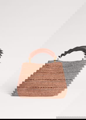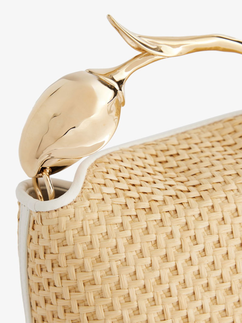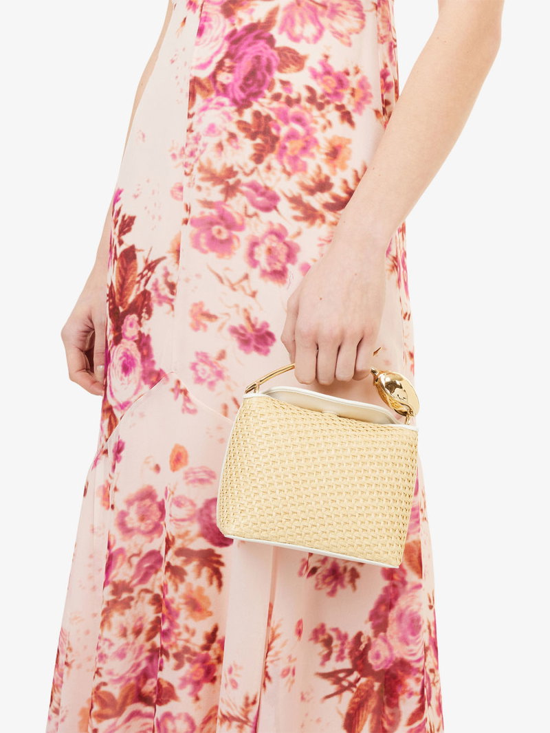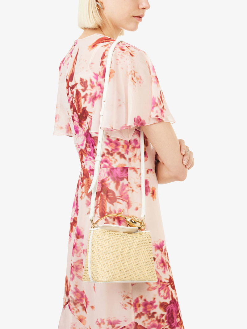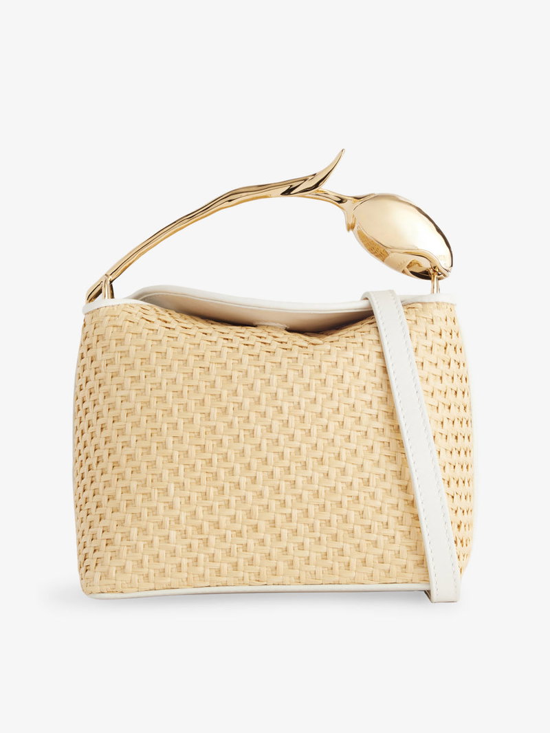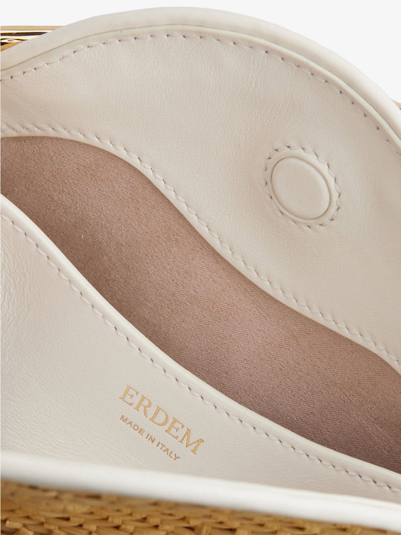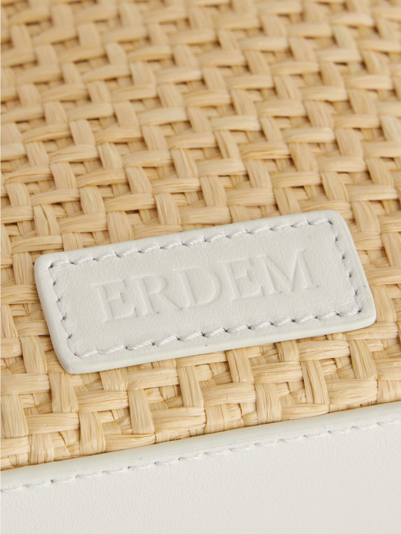 Erdem raffia handbag. Magnetic closure. Rectangular shape, sculpted flower design top handle, detachable adjustable shoulder strap, polished hardware, double compartment, internal slip pocket and foiled branding.