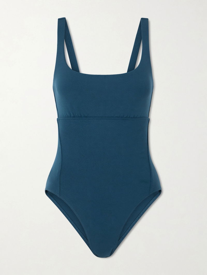 Eres' pieces "highlight the body's natural beauty." Cut from the label's sculpting <i>peau douce</i> fabric, this navy 'Arnaque' swimsuit has deftly placed seams along the bust and sides to enhance your figure. The square neckline is framed by wide shoulder straps for extra support on active beach days.