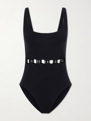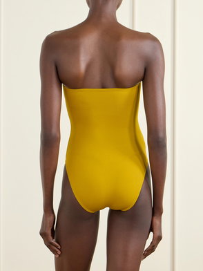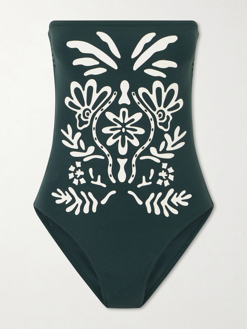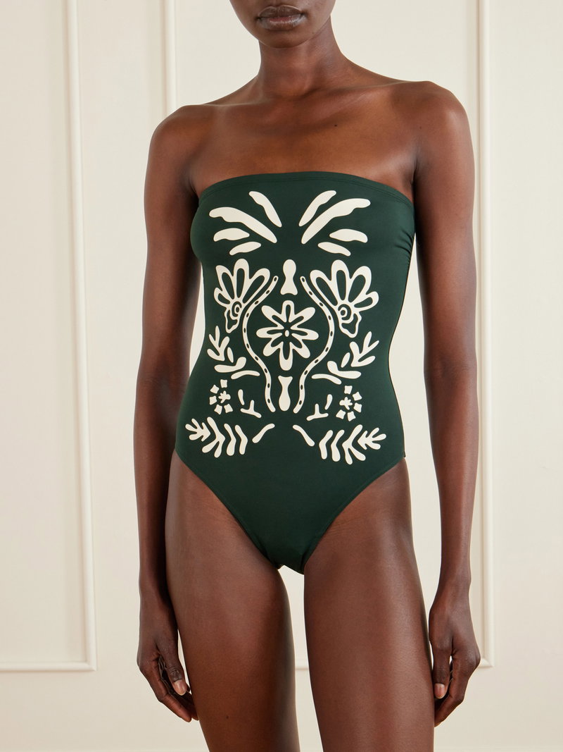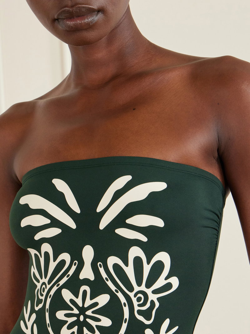 Renowned for its signature peau douce fabrics, Eres designs pieces that move effortlessly with the body, exemplified by the ‘Maharani’ swimsuit. Cut from stretch fabric, it features a strapless, fitted silhouette adorned with a botanical print. Pair it with sandals and statement sunglasses for a chic, tropical-ready look.