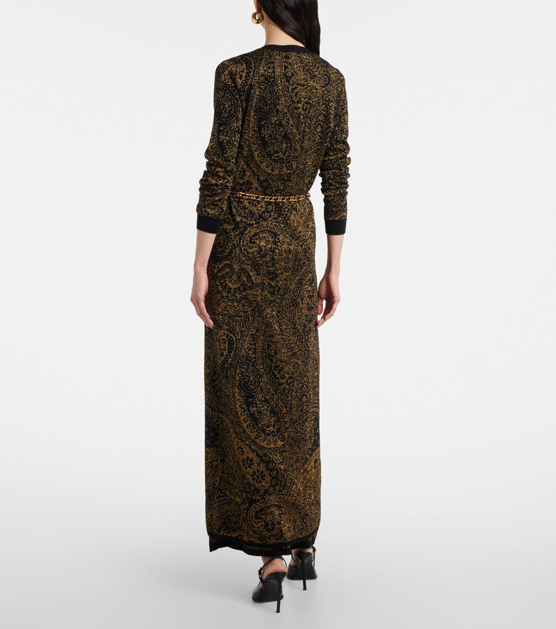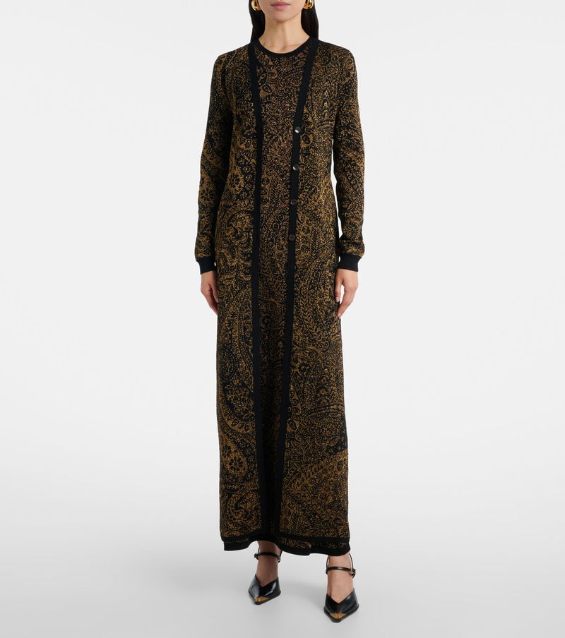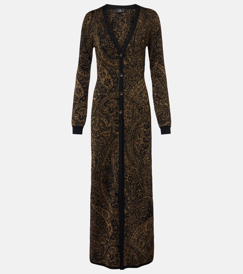 Make a bold sartorial statement in styles from Etro, like this long cardigan. The design is made from a wool-blend fabric with shimmering lamé threads and features an intricate paisley motif.