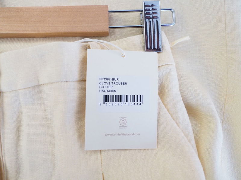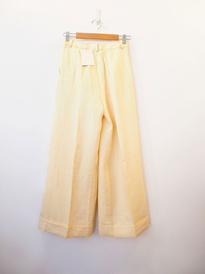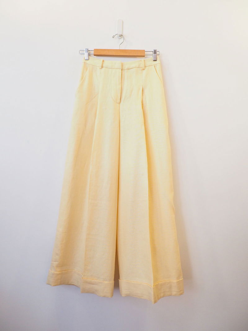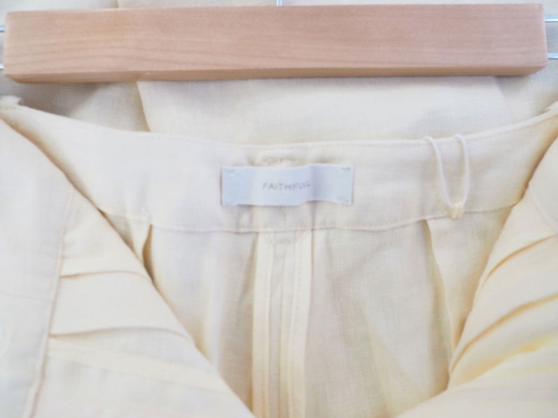 Faithfull The Brand linen trousers. Belt loops, pleats at waist, side slip pockets, pressed crease through legs, turn-up cuffs.