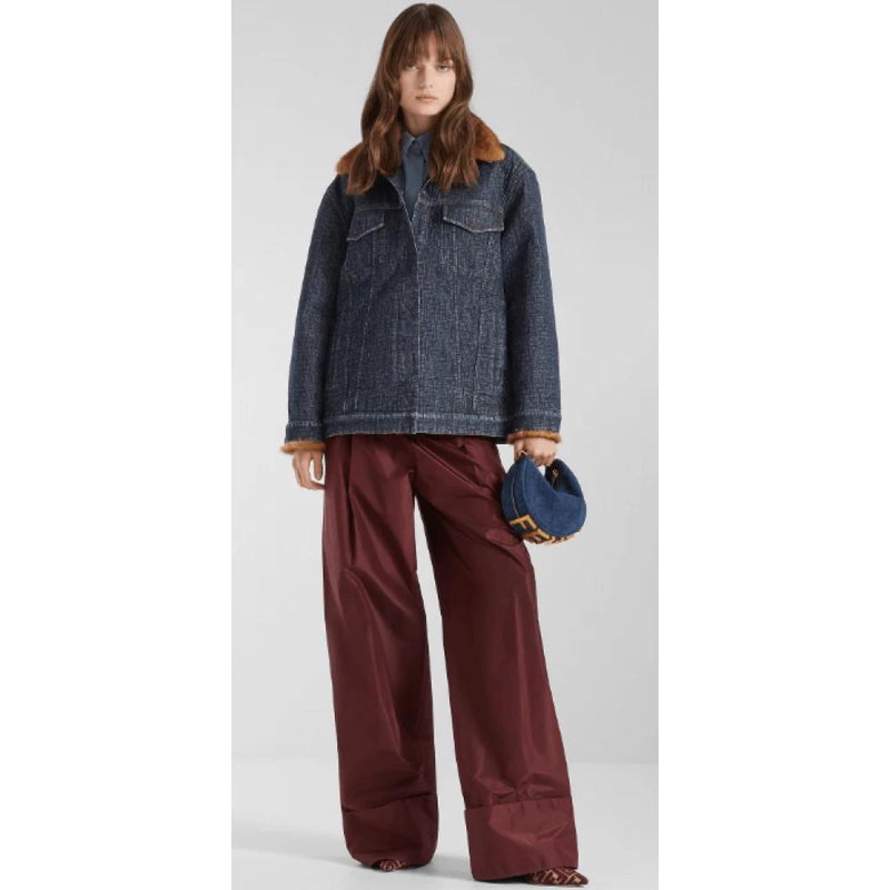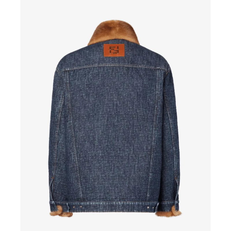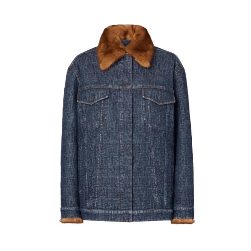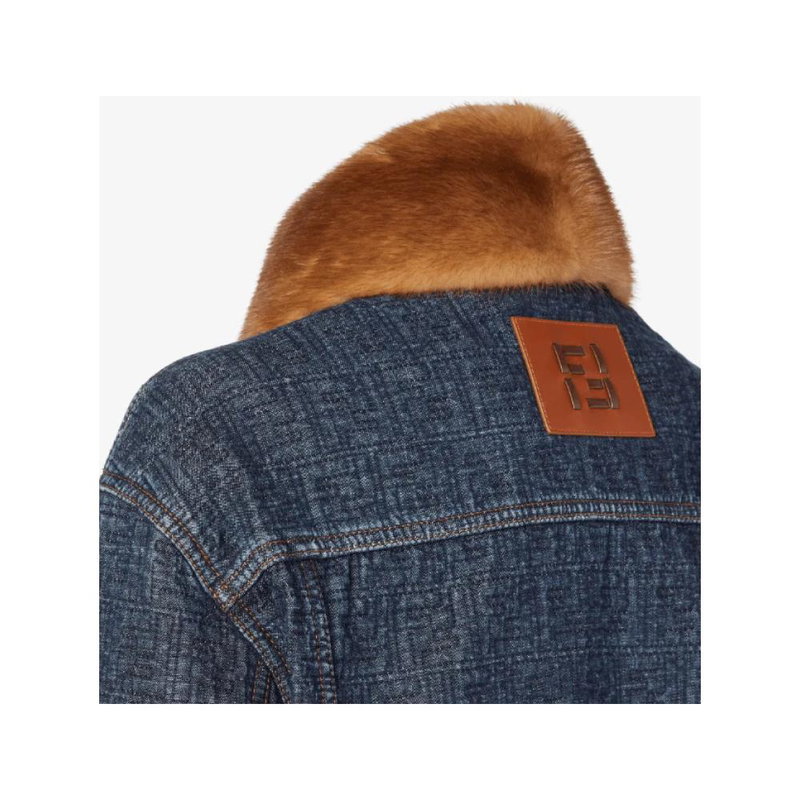 Fendi FF Denim Blouson pairs a boxy silhouette with an all-over quilted FF motif and mink fur trim, designed as a luxury statement jacket for cool-weather layering.