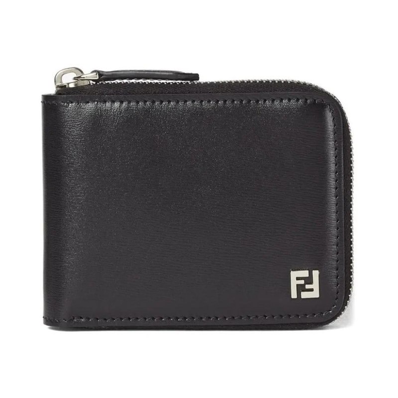 Fendi Squared FF Wallet is a compact calf leather bi-fold with a zip closure, designed for organized everyday carry and secure storage of cards and notes.