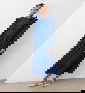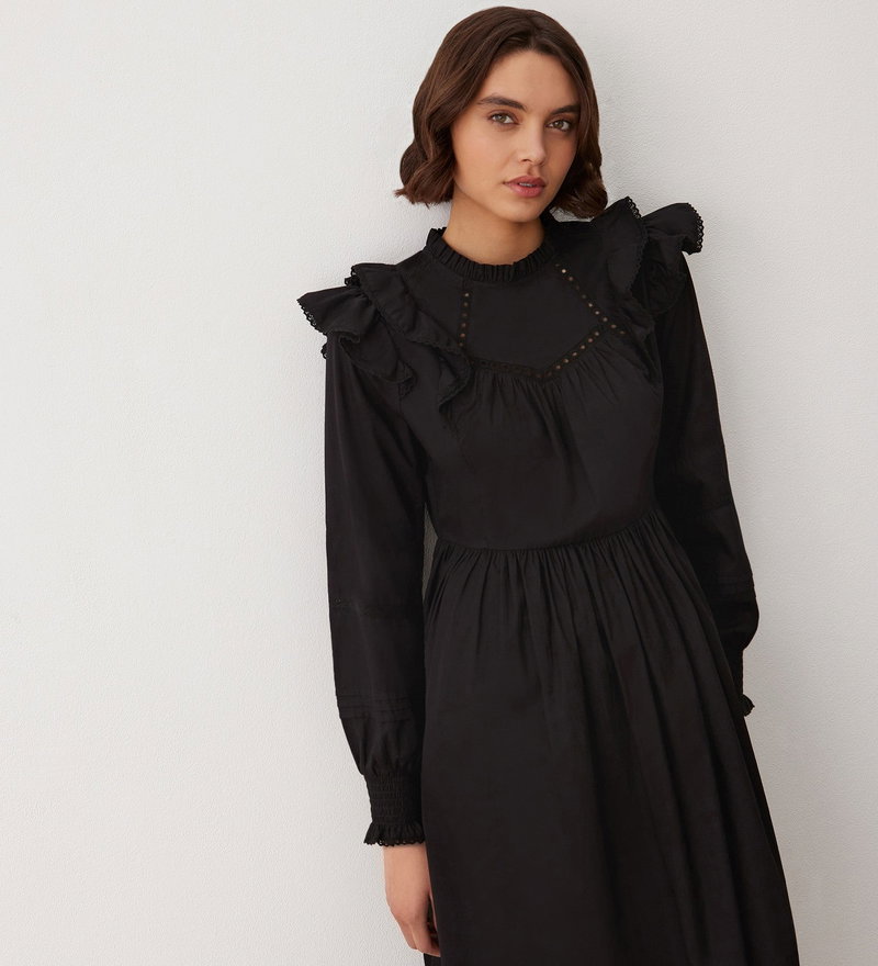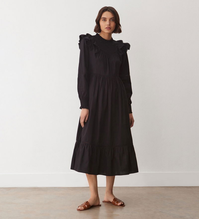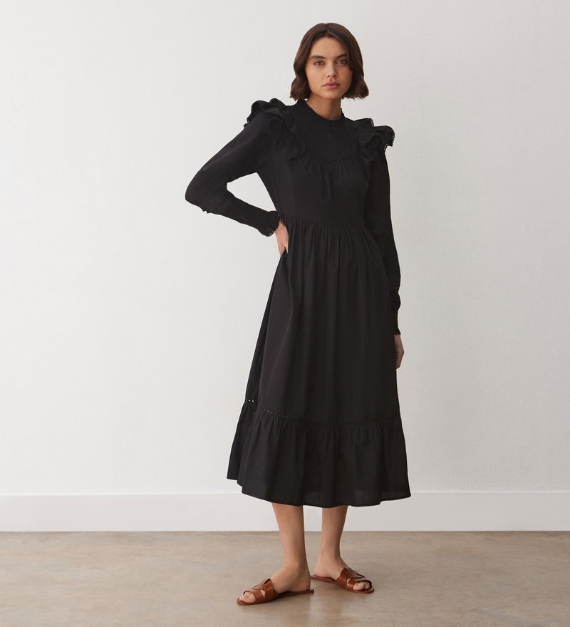 Adela is our 100 per cent cotton midi dress with long blouson sleeves that end in shirred cuffs with a frill edge. She also features a frill edge neckline and double frill detail at the shoulder. Note also the lace detail panels on both the shoulder and hemline.