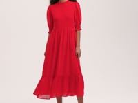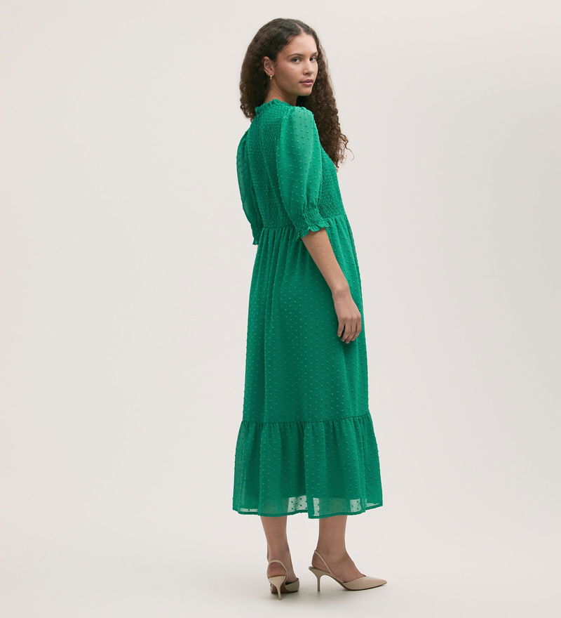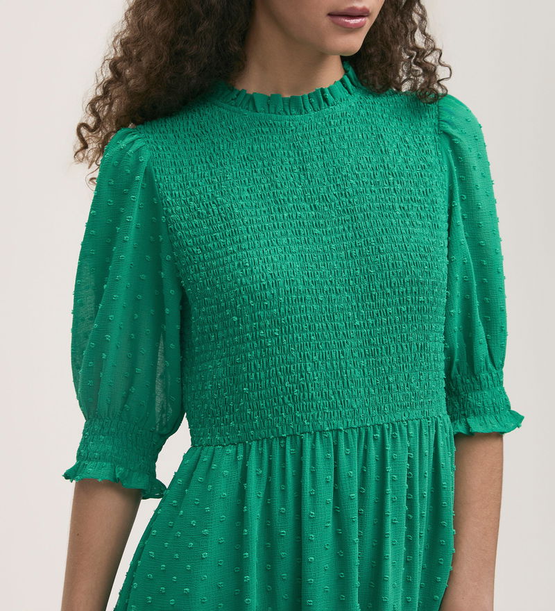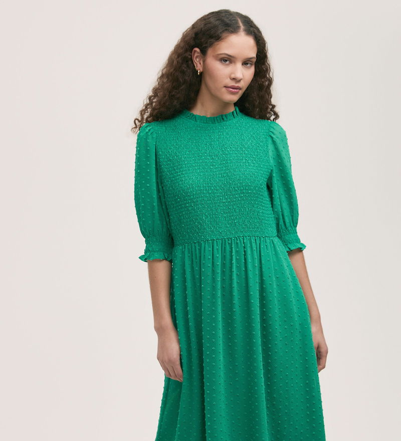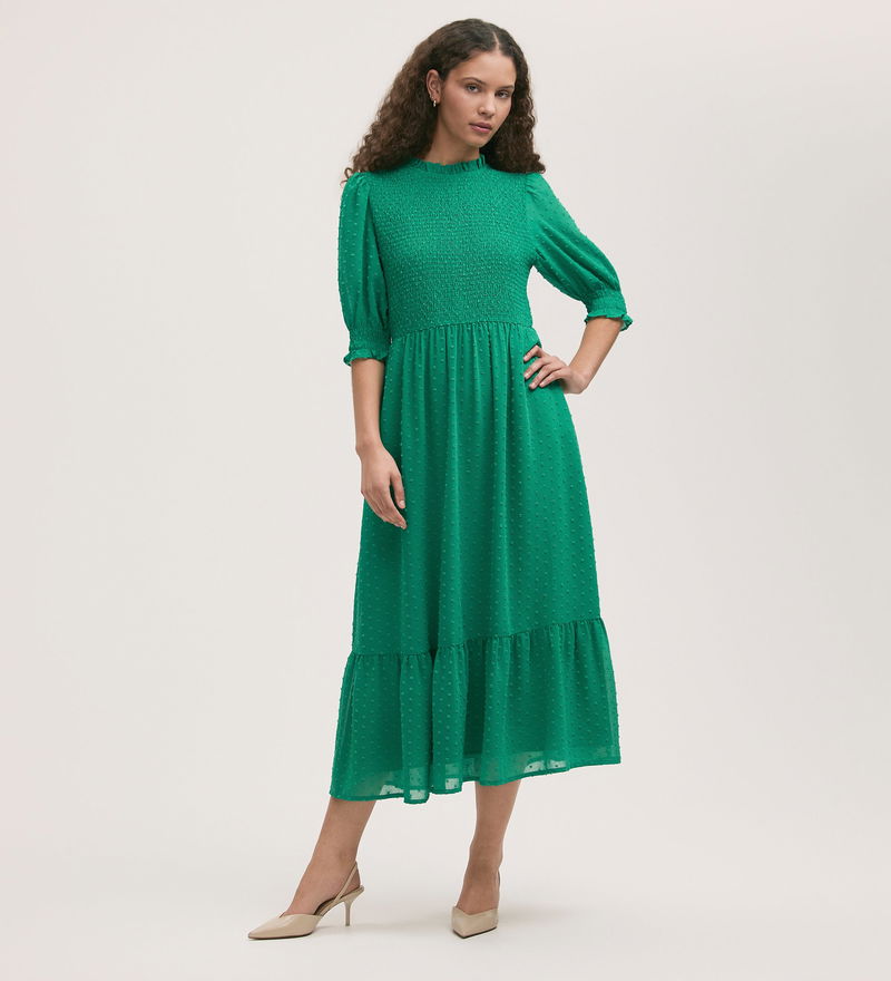 With an eye-catching shirred bodice, Amelia is a green tiered midi dress crafted from chiffon with frill detail on both the neckline and cuffs. Puff sleeves and a tiered skirt add volume to this effortlessly stylish look.