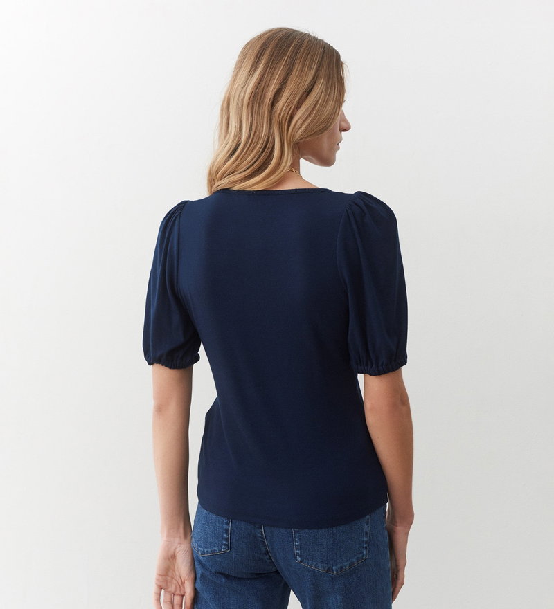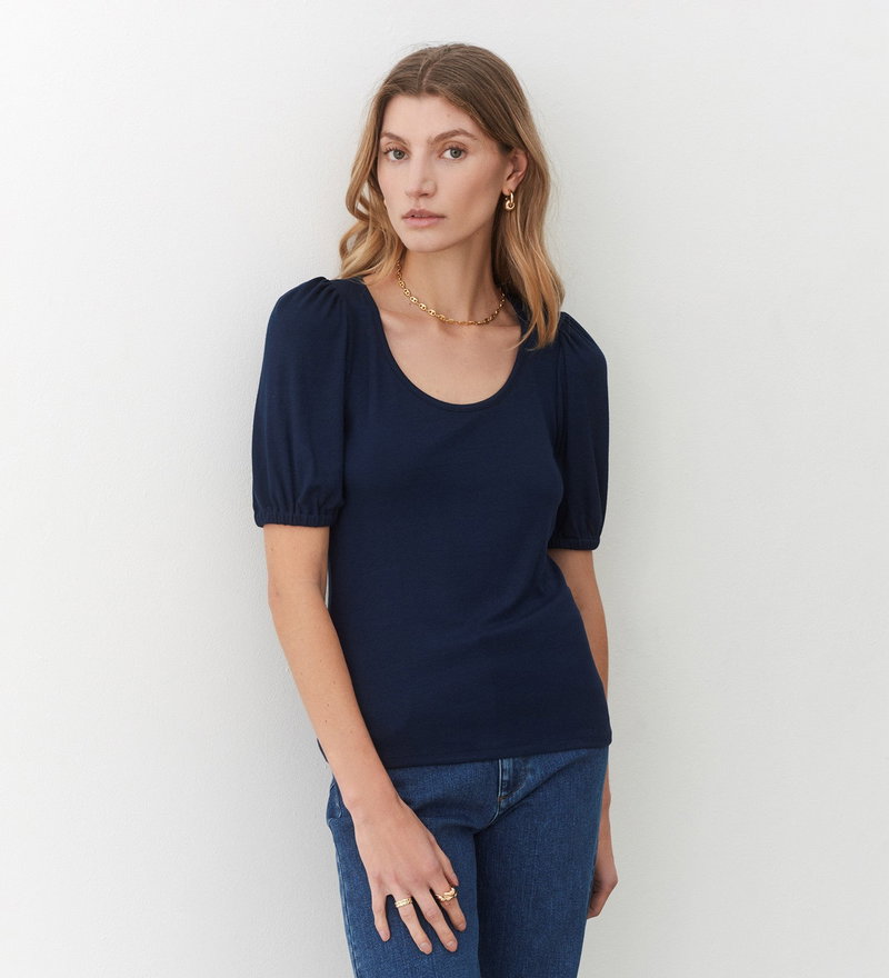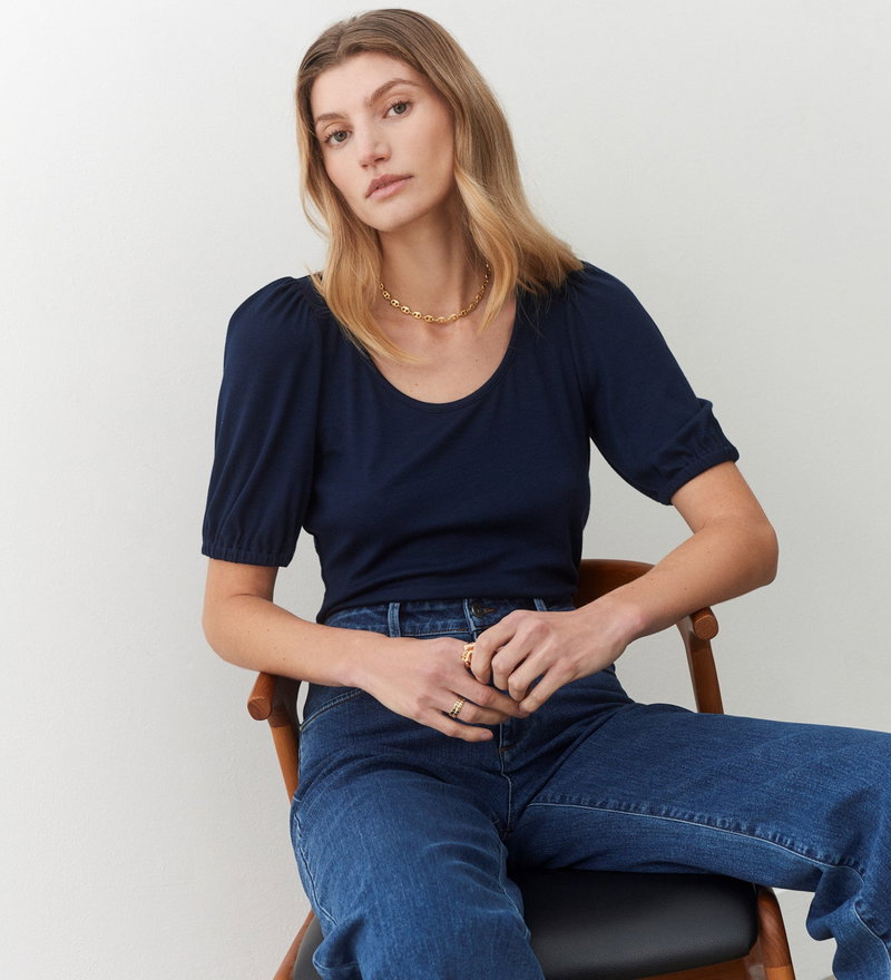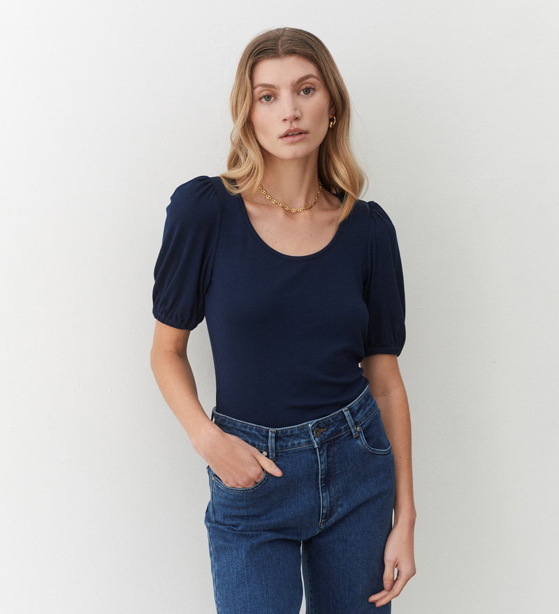 Crafted from our ribbed jersey fabric, Ana is a crew neck t-shirt with short, puffed sleeves and elasticated cuffs. Soft against the skin and a versatile wardrobe addition, pair yours with jeans, trousers or a midi skirt to complete the look.