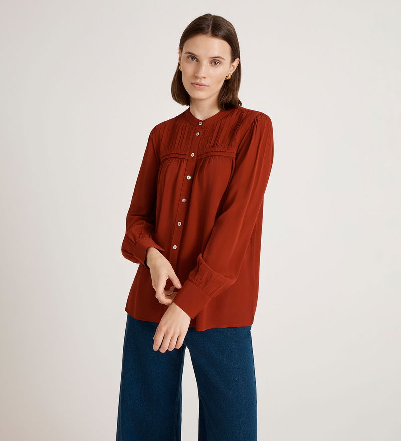 Andrea is a timeless blouse offering understated sophistication. Featuring a mandarin collar and a button-through front, she's finished with elegant faux mother-of-pearl buttons. Delicate pintuck detailing adds subtle texture, while long sleeves with cuffs bring polish to the relaxed silhouette. Crafted from lightweight crepe, Andrea drapes effortlessly, making her a versatile piece for both work and weekend styling.