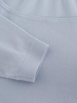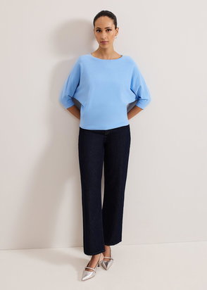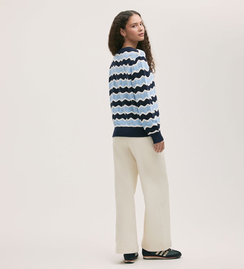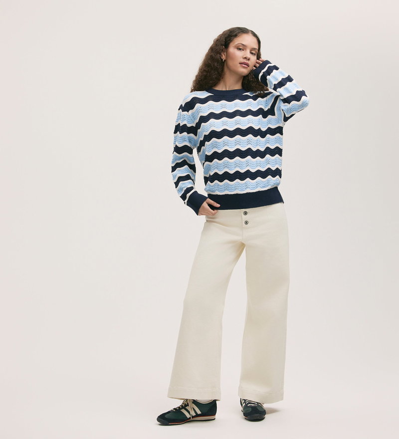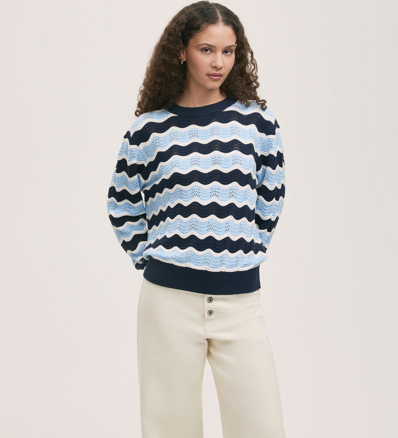In a wavy striped design, Antonia is a navy and light blue crochet jumper with long sleeves and dropped shoulders for a relaxed fit. She also features ribbed detail on the cuffs, hem and neckline.
