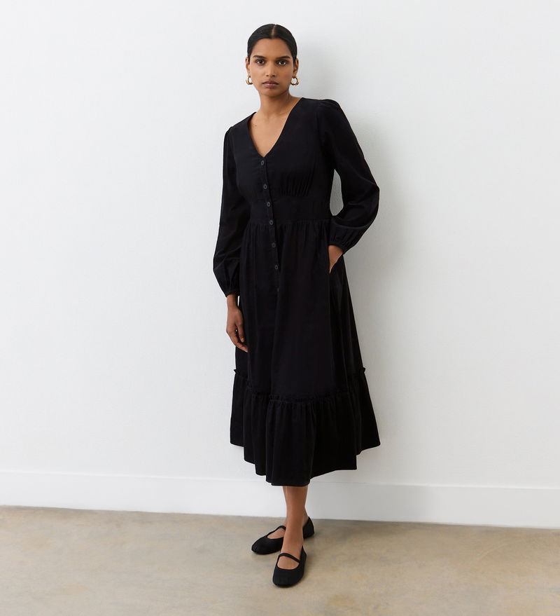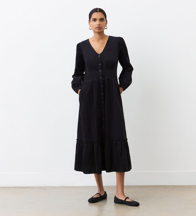Crafted from corduroy, Arizona is a button-through midi dress with a tiered hemline, functional pockets and a flattering empire shaped waistband. Long elegant sleeves flow into elasticated cuffs and rear shirring detail helps to flatter the figure.