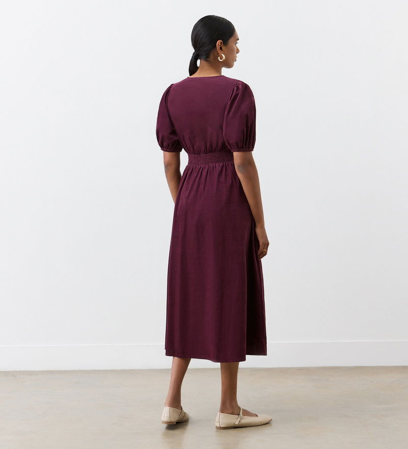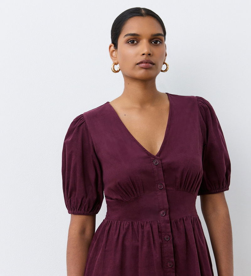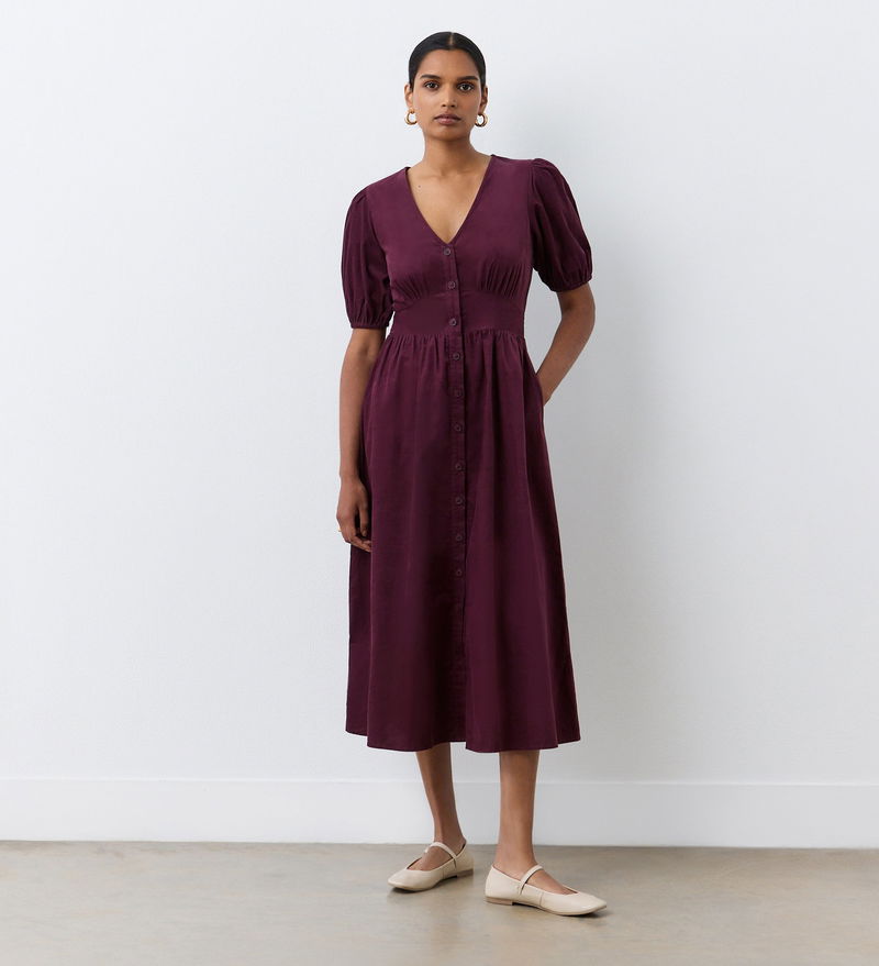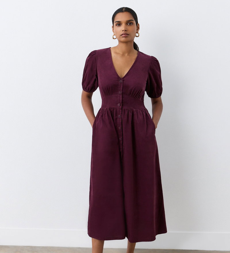 In a luxurious corduroy fabric perfect for the autumn season, Arlow is a button through midi dress with a v-neckline and elasticated puff sleeves. She also features functional side pockets and a flattering waist panel.