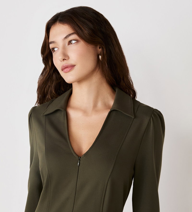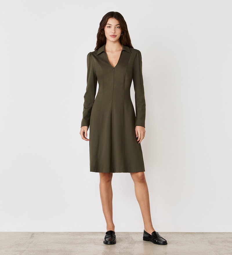 Bethany is a timeless and versatile khaki knee-length dress, crafted from Ponte jersey with a chic collar and v-neck detailing, as well as a functional, discreet front zip. Designed to promote a flattering fit, she features straight long sleeves and pairs well with tights and boots.