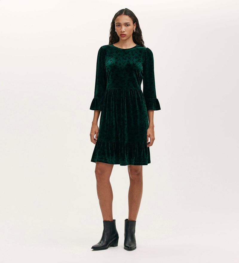 Designed with a round neckline and a delicate keyhole opening at the back, Camie is a relaxed fit tiered mini dress with three-quarter sleeves finished with a playful ruffle cuff. Crafted from plush jersey velvet, Camie catches the light with a subtle shine, adding a hint of soft glamour to effortless yet elevated dressing.