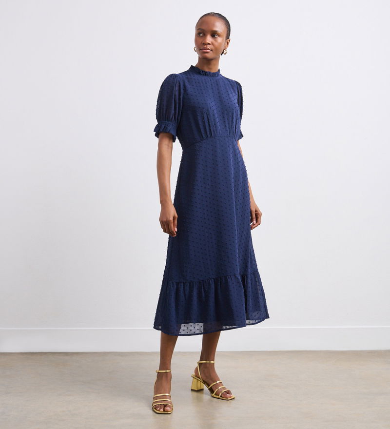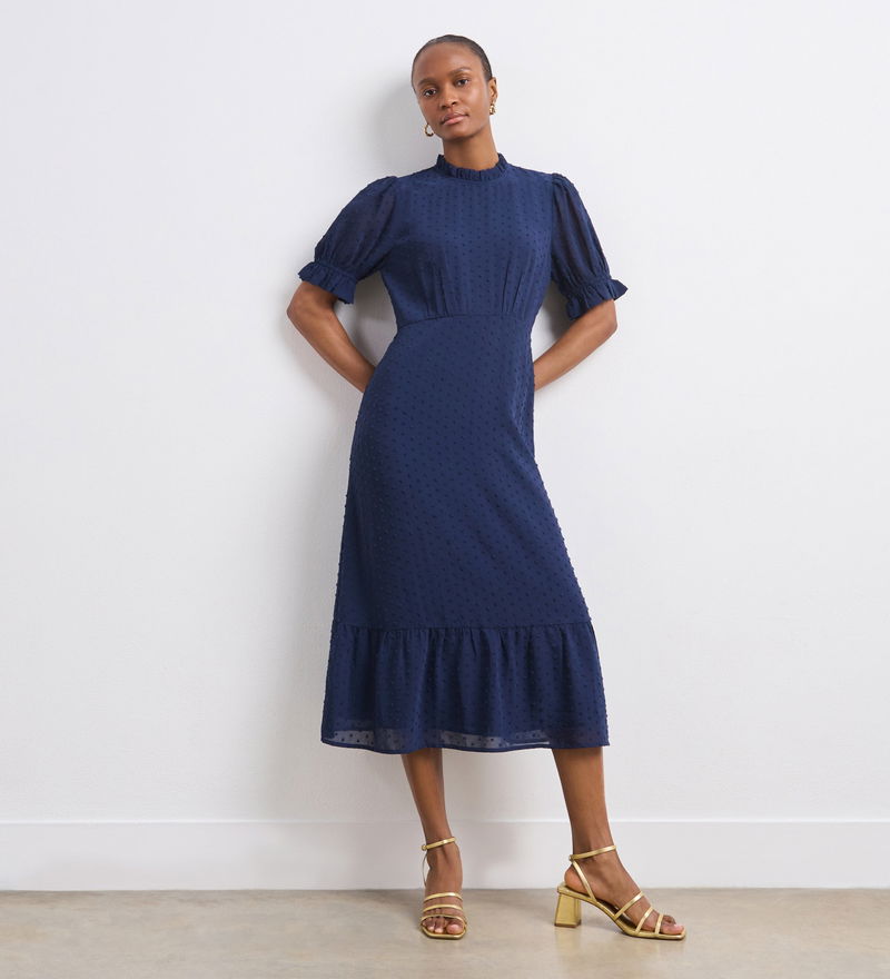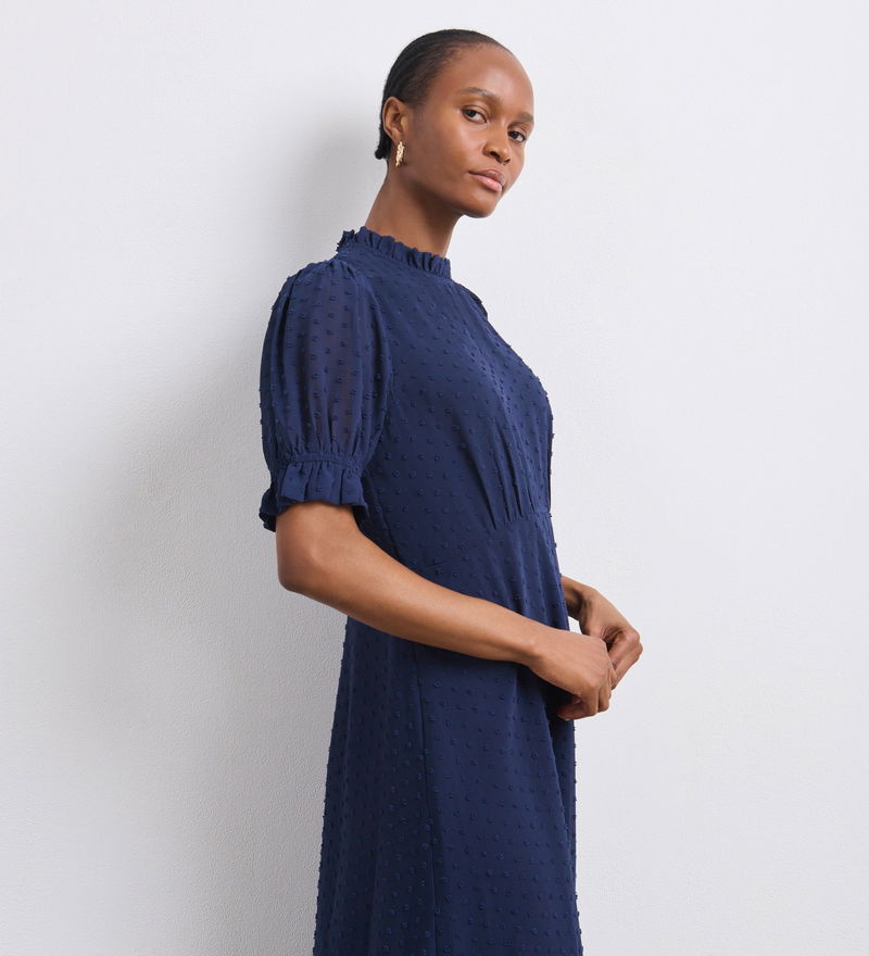 Twirl into any occasion in our Camille navy chiffon midi dress. Featuring a high ruffle neck with matching ruffled elasticated cuffs on voluminous short sleeves, this dress will become an easy-to-wear staple. Made from soft chiffon, the tiered hem adds movement to the skirt, while the waisted seam that gathers under the bust creates a flattering silhouette.