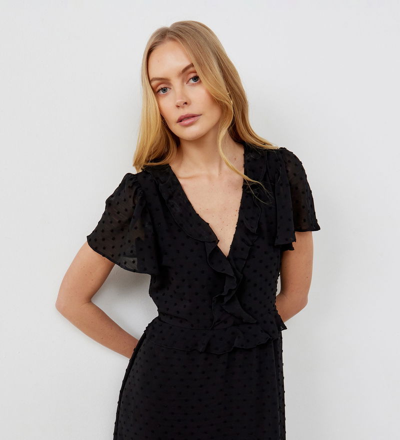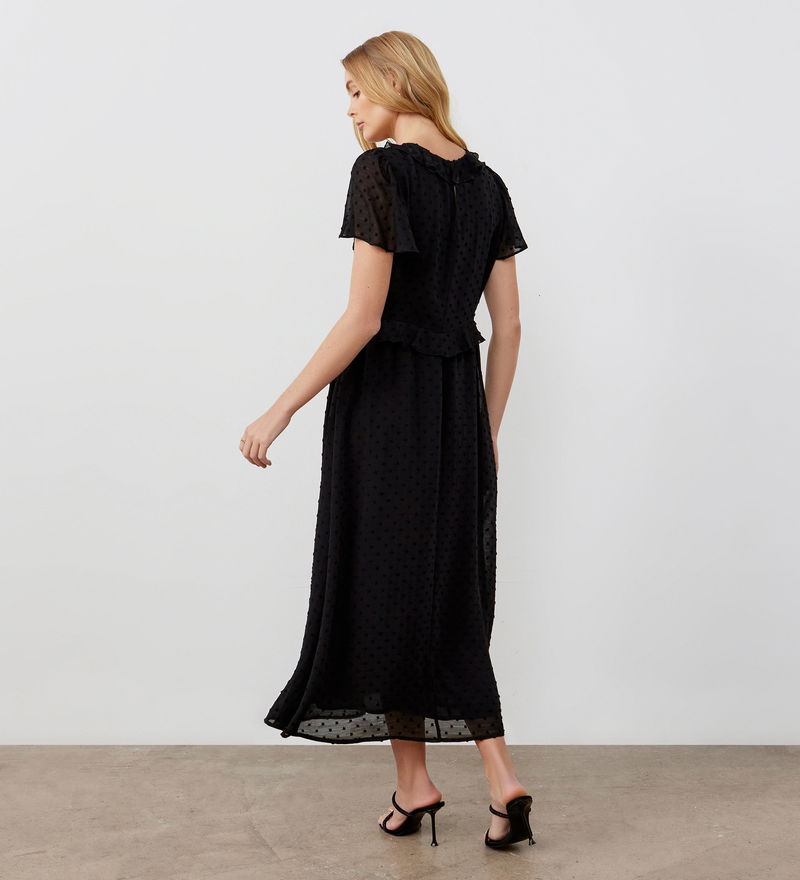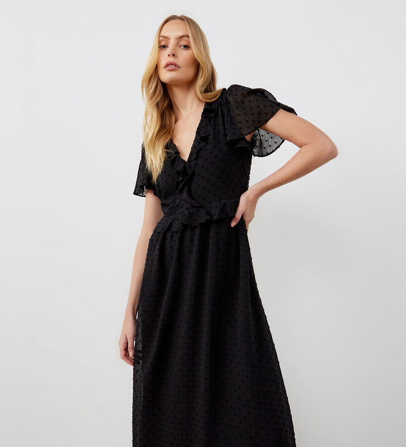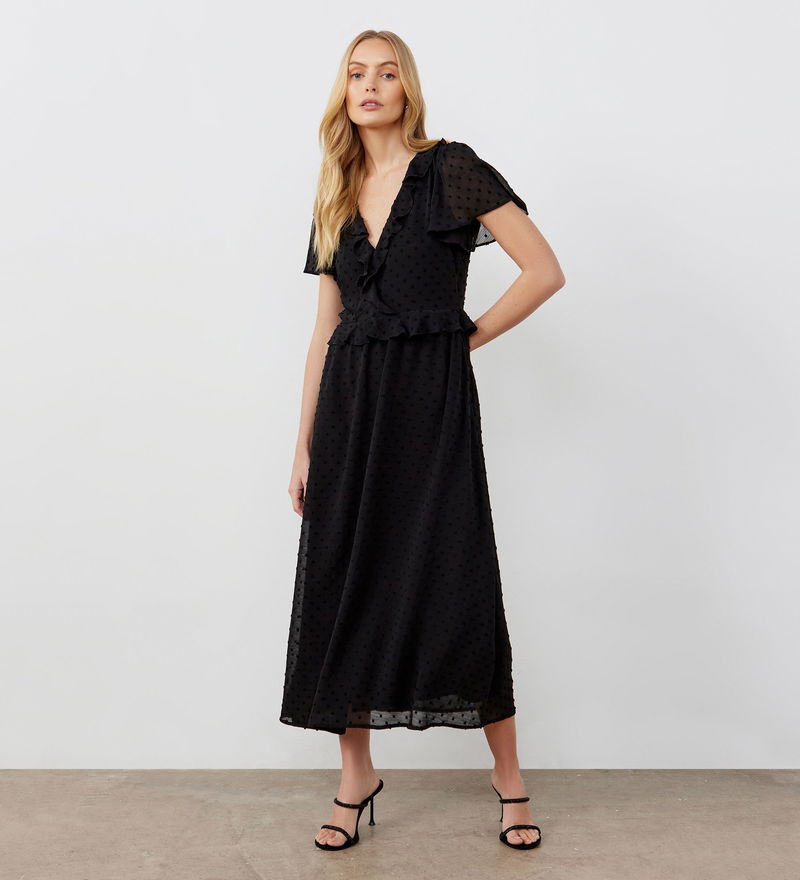 A V-neck midi dress, Dahlia is crafted from crinkle chiffon with textured spot detail and features short frill sleeves. Gathering at the waist, as well as ruffle detail on the neckline and waist, Dahlia flatters the silhouette. An invisible side zip and rear keyhole and button fastening also makes for a flattering fit.