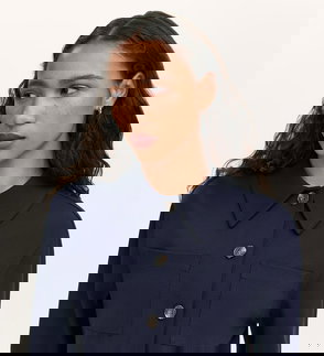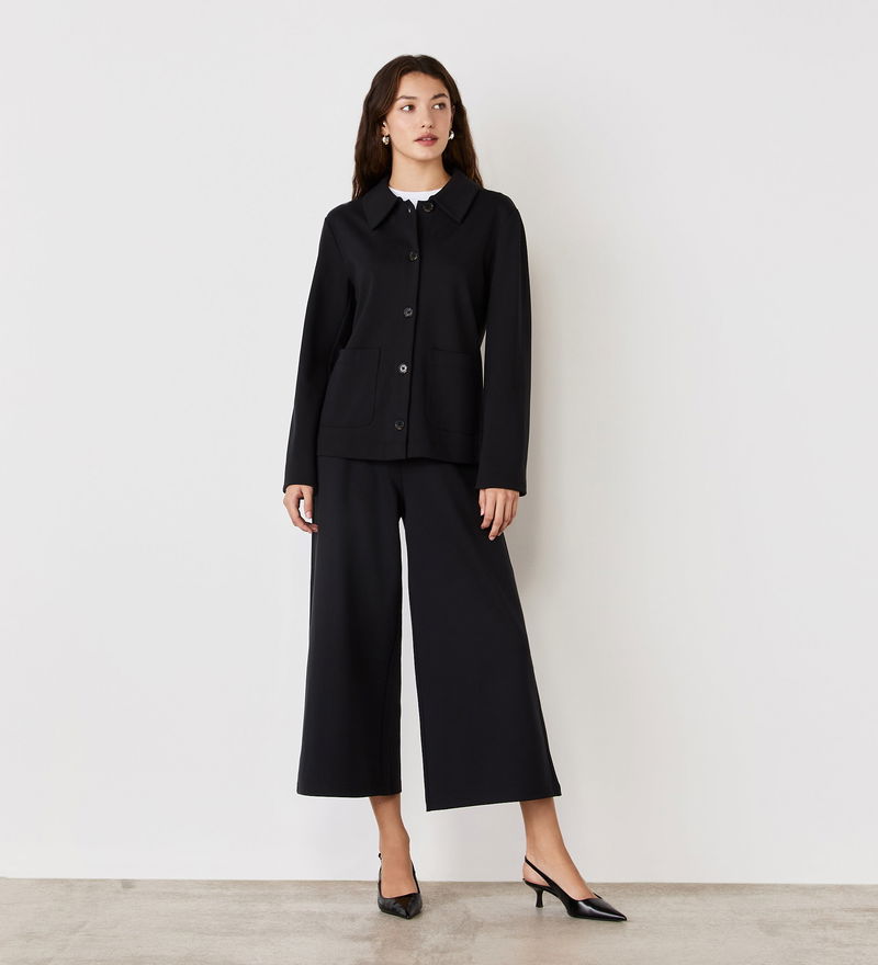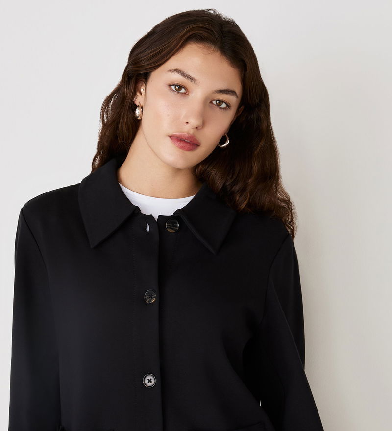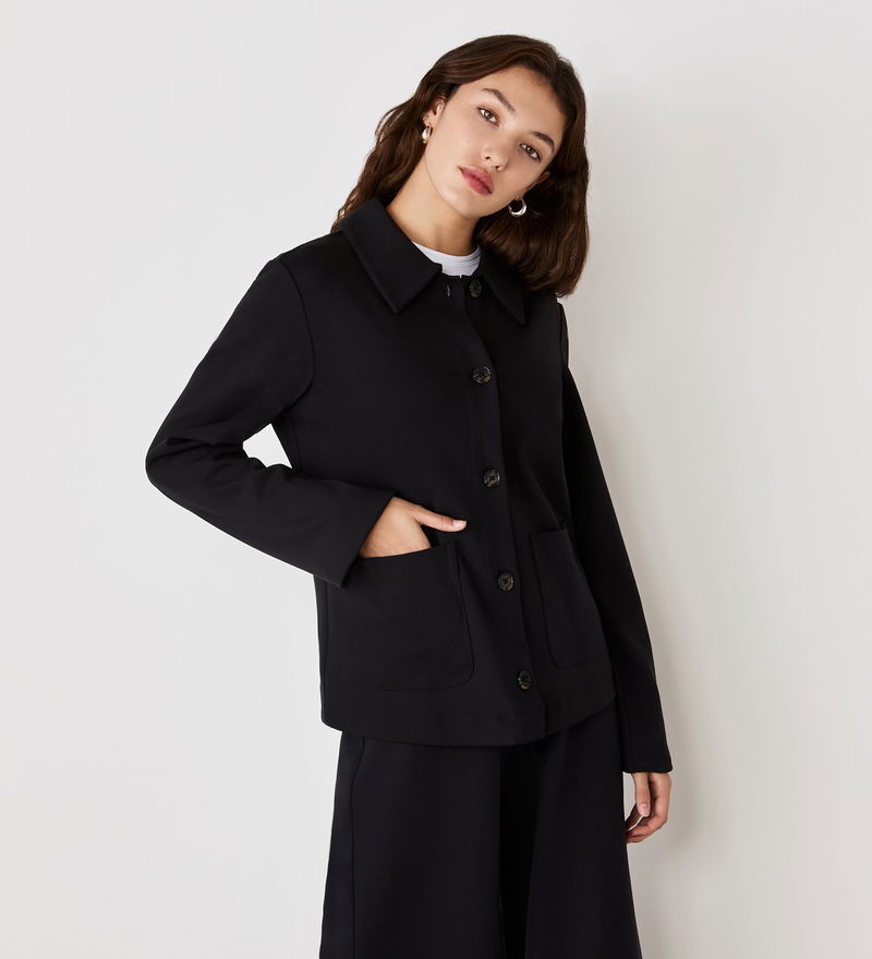 Casual in style, Enola is a black button-up ponte jersey jacket with collar detail and two front patch pockets.
