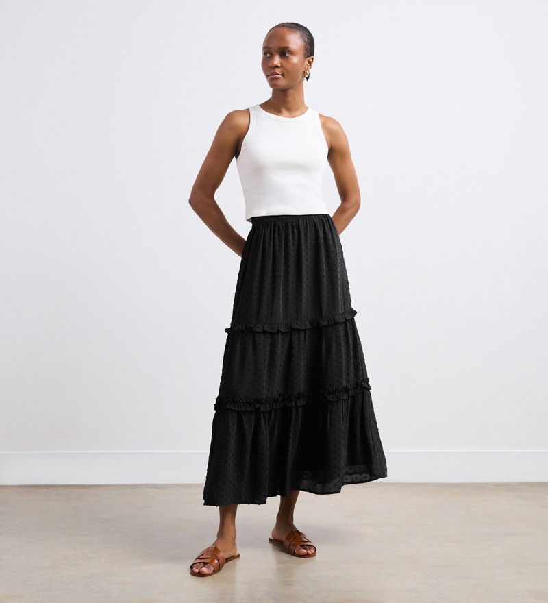 Everley is a fully lined tiered midi skirt in a textured spot detail with ruffled tiered detailing. She also features a concealed side zip for a flattering fit.