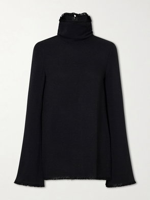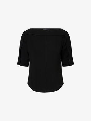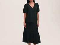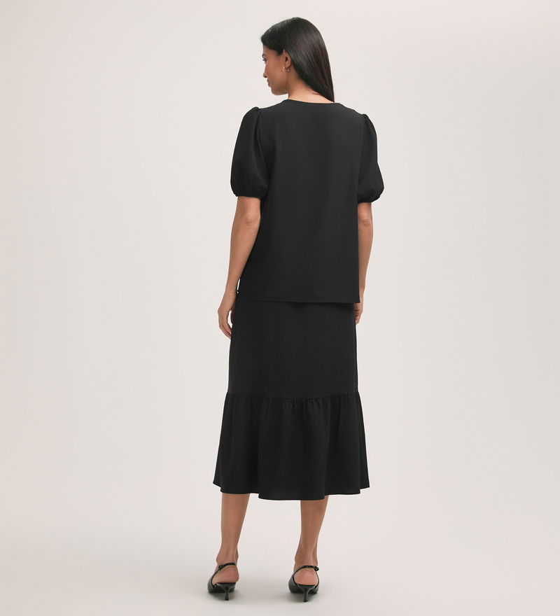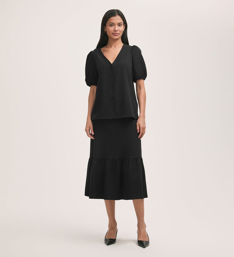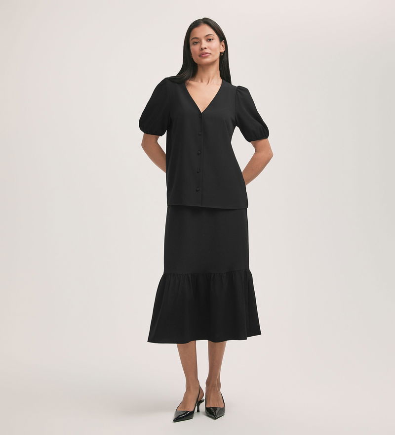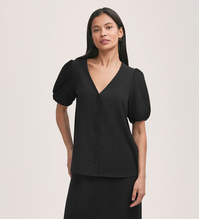 In a relaxed-fit with a feminine v-neck, Fleur is a versatile black button-up blouse with short puff sleeves, crafted from our crease-free crepe fabric.