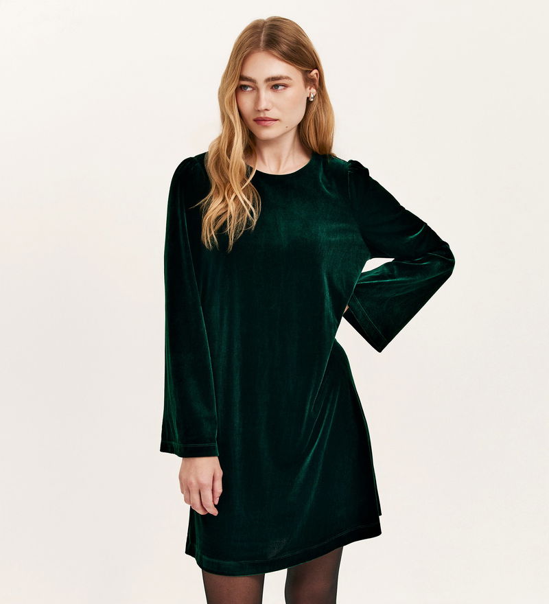 Hattie is a relaxed-fit mini dress that combines ease with a touch of elegance. Designed with a classic round neckline and rear keyhole fastening, she also features long sleeves for a balanced, flattering shape. Crafted from plush jersey velvet that catches the light with a soft sheen, Hattie is the perfect wardrobe addition for effortless party dressing.