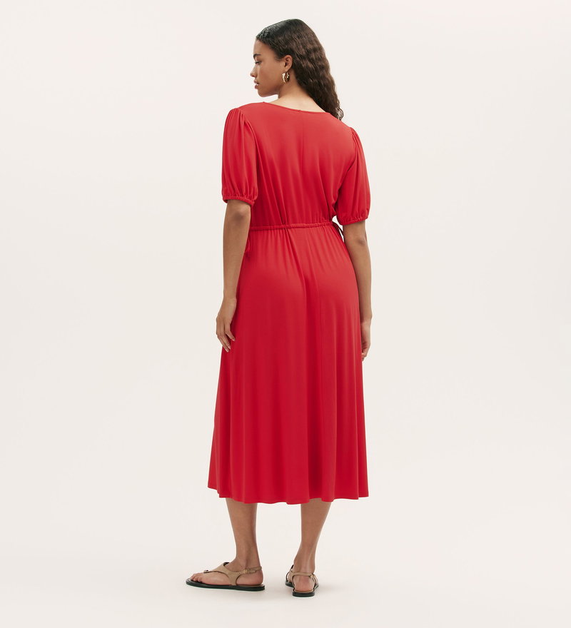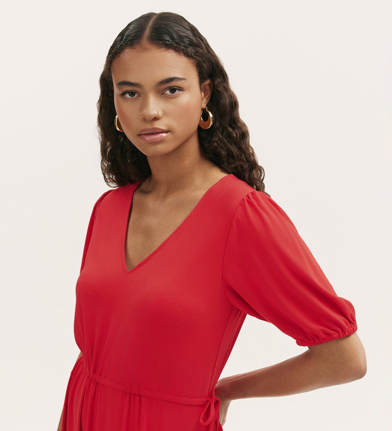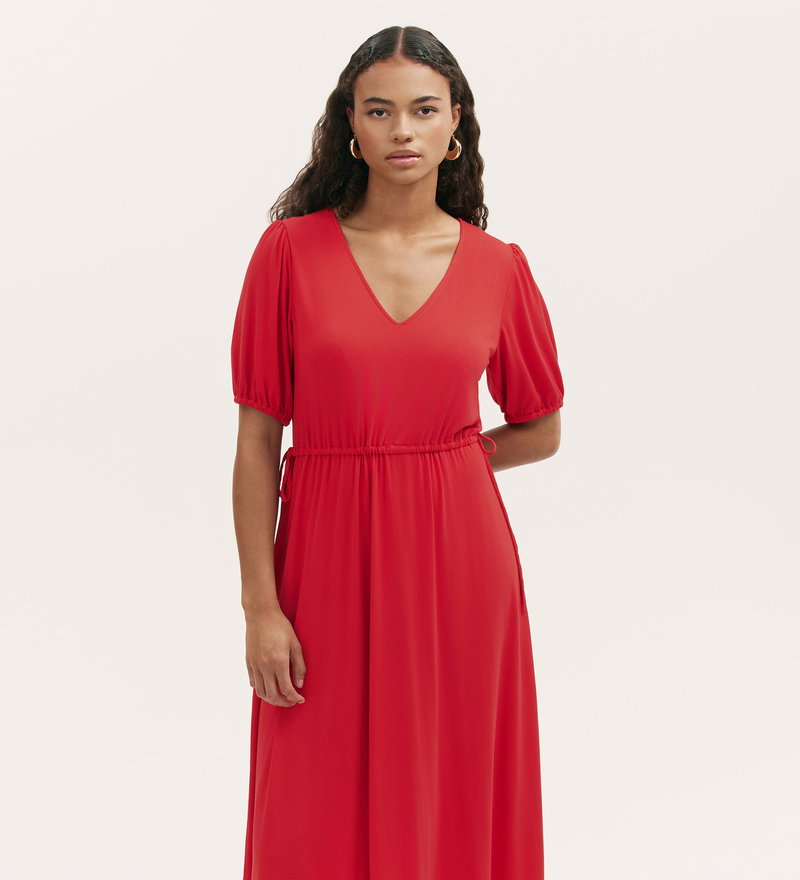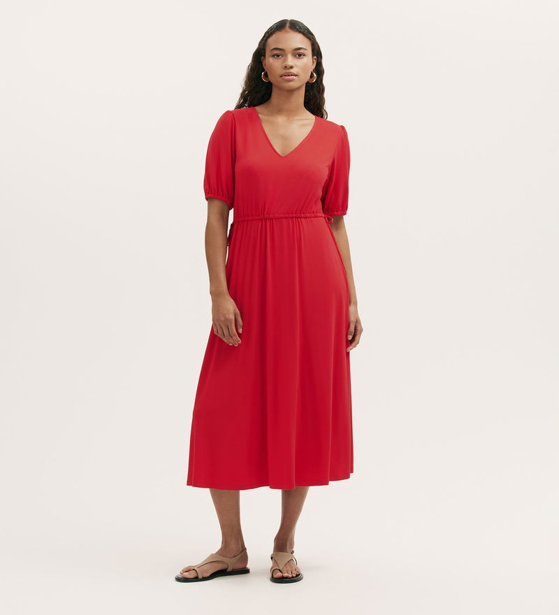 Simple yet enduring, Hessa is a red v-neck midi dress, cut from smooth jersey for an effortlessly relaxed fit. A drawstring-gathered waist with tie detail and elasticated short sleeves add to its flattering fit and flare silhouette. Dressed up or down, Hessa is a versatile wardrobe staple you can rely on, season after season.