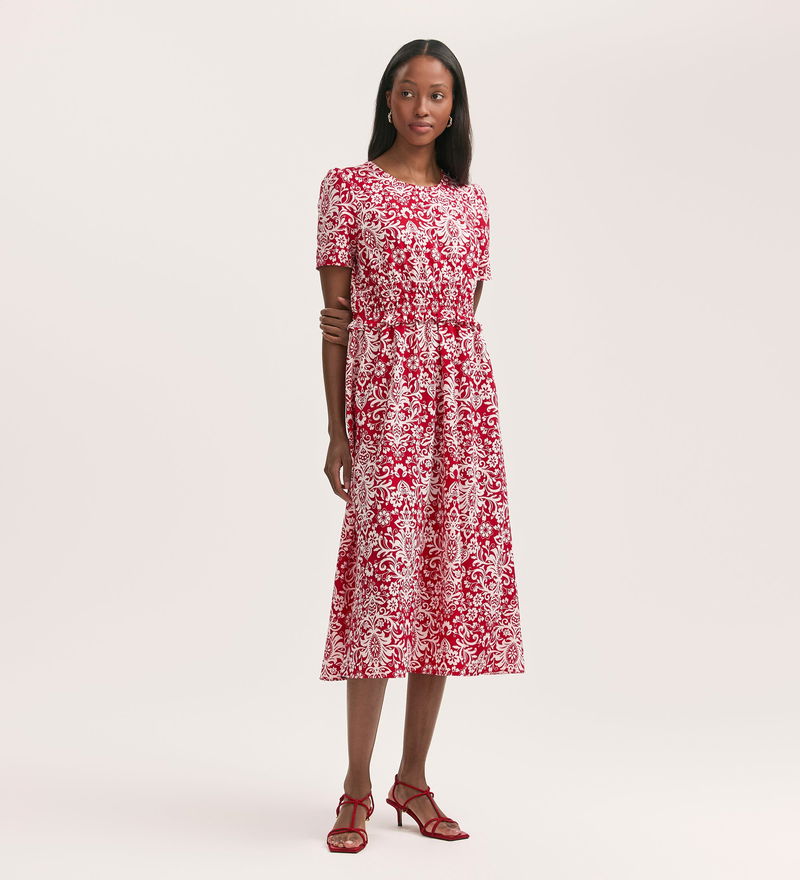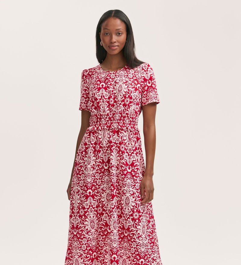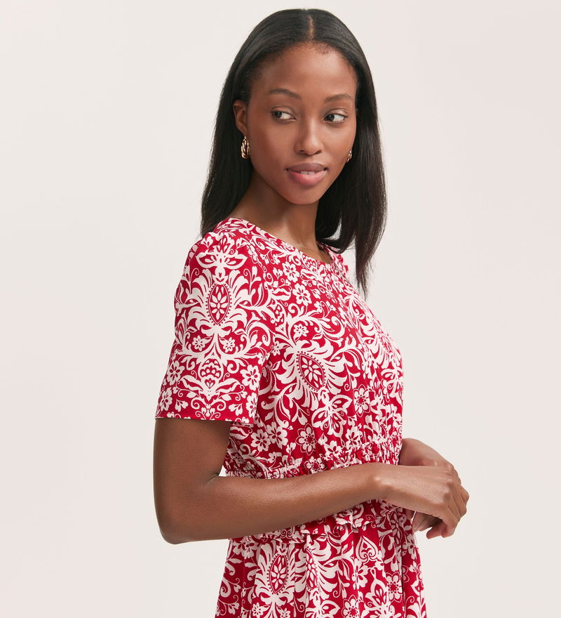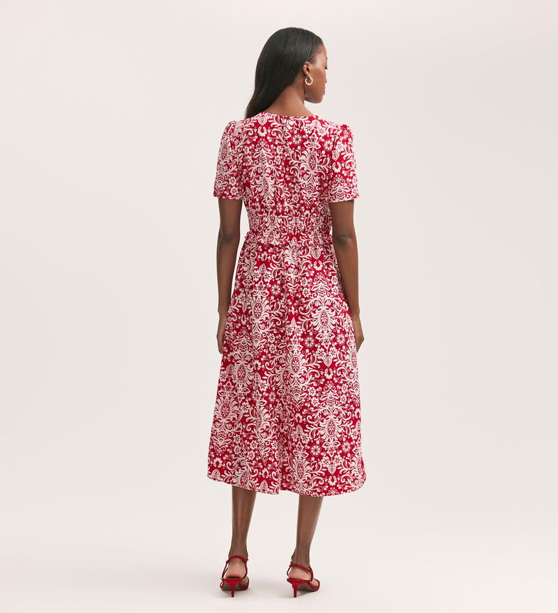 We love this elasticated waist with frill detail on our Irini red paisley midi dress. Crafted from crepe and featuring short sleeves and a crew neck, she's the perfect outfit for every occasion.
