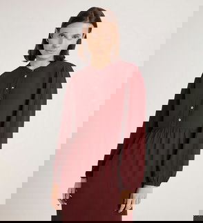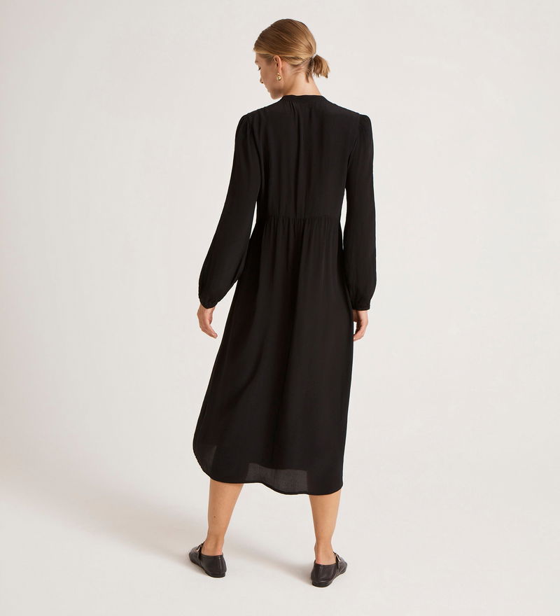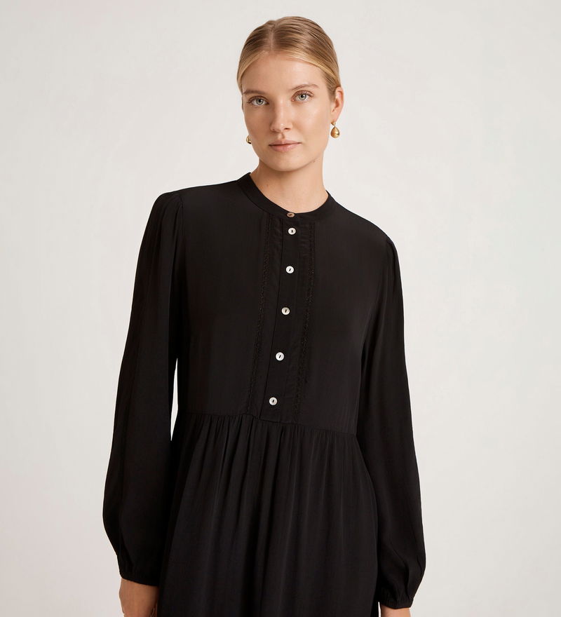 Jasmine is a vintage-inspired midi dress, designed with a delicate mandarin collar and faux mother-of-pearl buttons. She also features lace trim detailing for a subtle, feminine touch. Long puff sleeves with buttoned cuffs add elegance, while the lightweight crepe fabric creates a soft, flowing silhouette. Jasmine is perfect for effortless day-to-evening dressing with a timeless, refined feel.