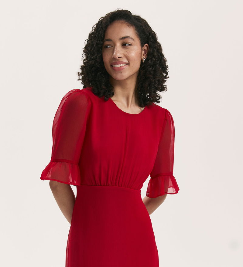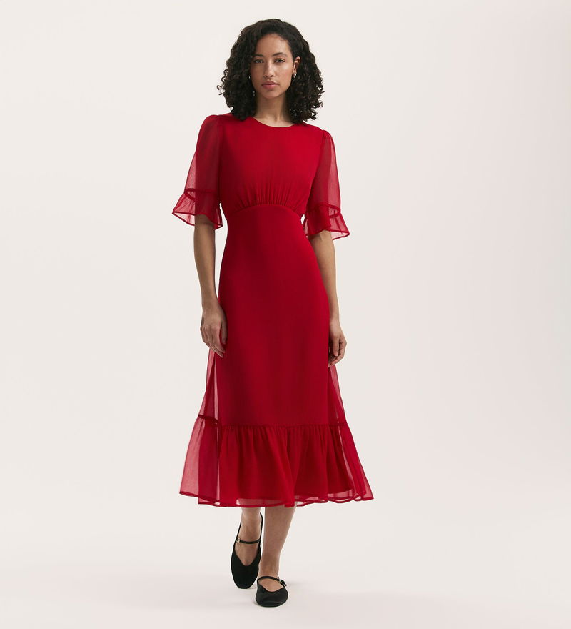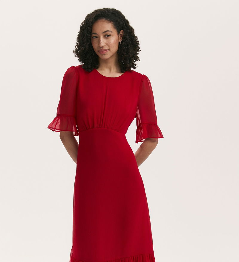 A round neck midi dress crafted from lightweight chiffon; Jennifer has short sleeves with ruffled cuffs and a tiered hemline to add to the fit and flare style. A gathered empire waist seam accentuates the silhouette, while the invisible side zip and rear keyhole button fastening make dressing simple and effortless.