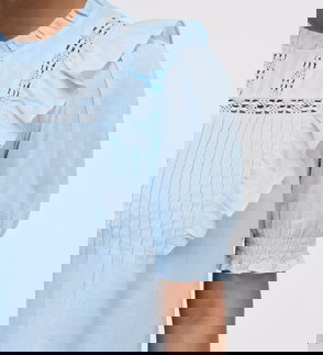 The feminine short puff sleeves are finished with comfortable shirred cuffs, while the round neck features a soft frill edge for an elevated touch. With a simple button fastening at the back neck, it is a dependable hero for sun-drenched garden parties, elevated office days, or polished weekend brunches.