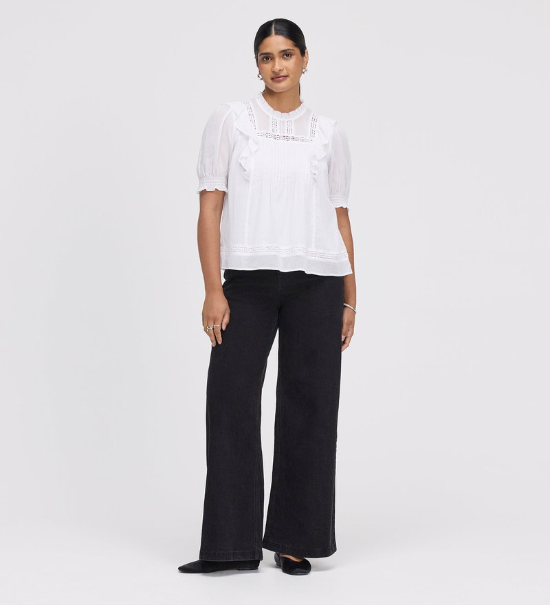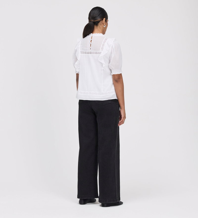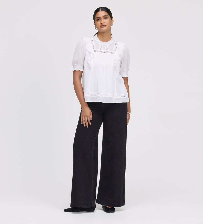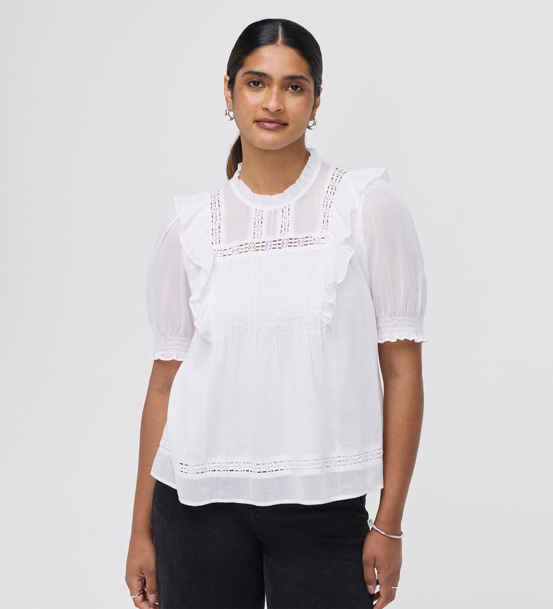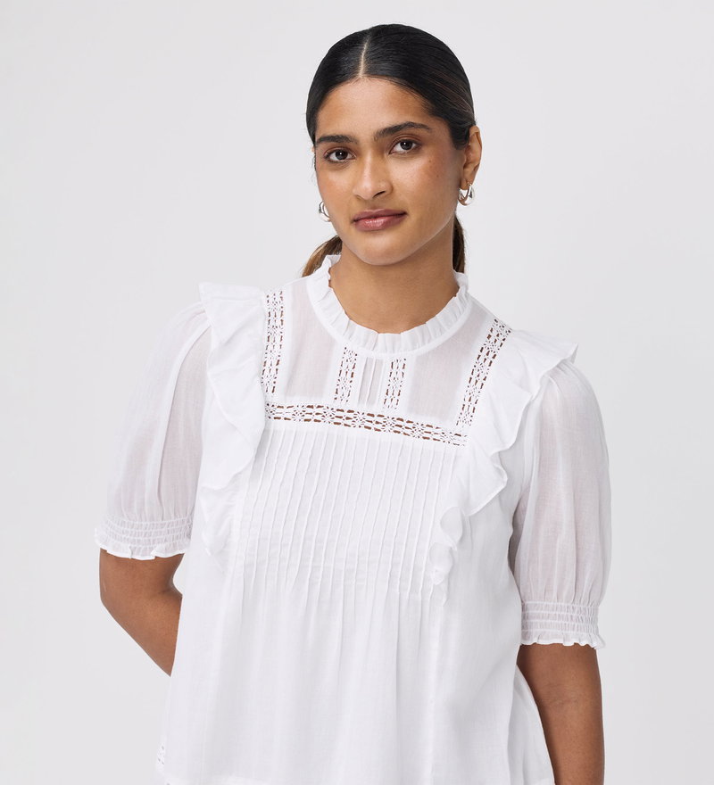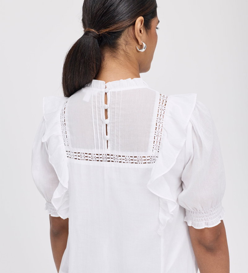 The Jolin Top is a celebration of delicate textures and vintage-inspired charm. Crafted from breathable cotton voile, this relaxed fit piece is defined by its intricate pintuck and lace detailing and romantic frill accents.