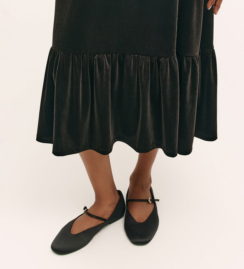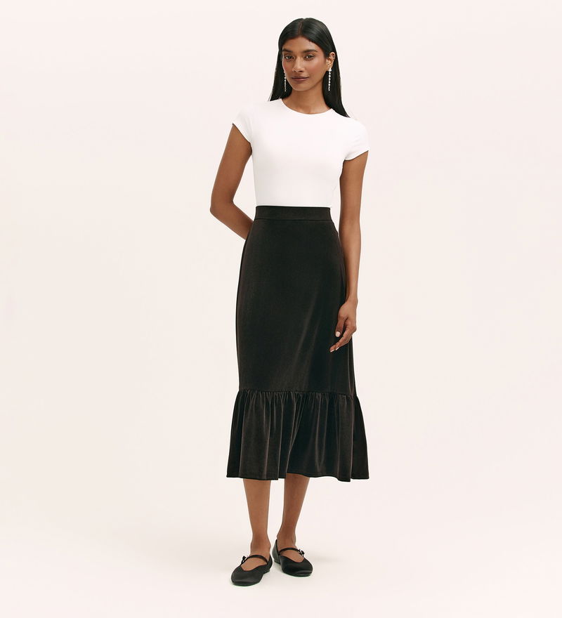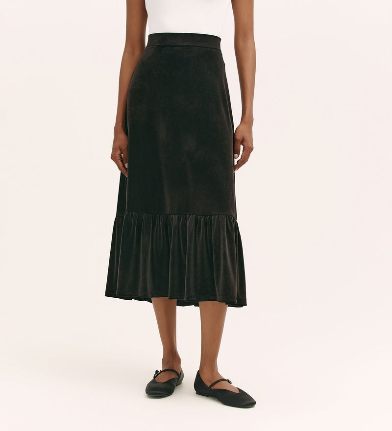 Joline is a tiered midi skirt that brings ease and elegance together in plush jersey velvet. Designed with an elasticated waistband, her softly gathered tiers create a fluid, flattering shape. Whether dressed up or styled casually, Joline offers rich texture and relaxed charm that transitions beautifully through the seasons.