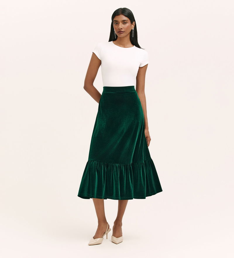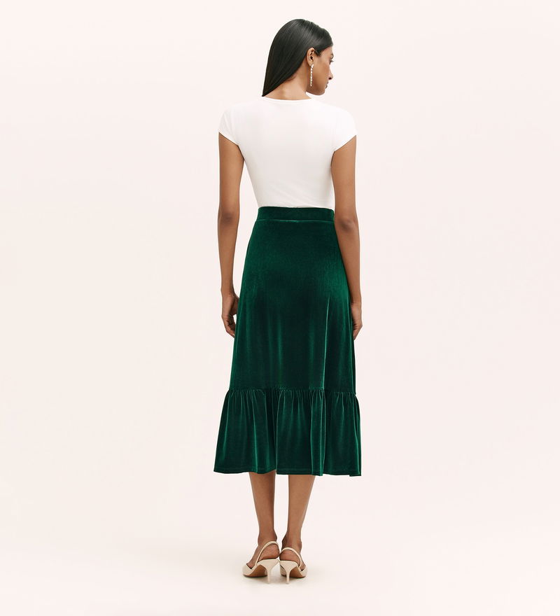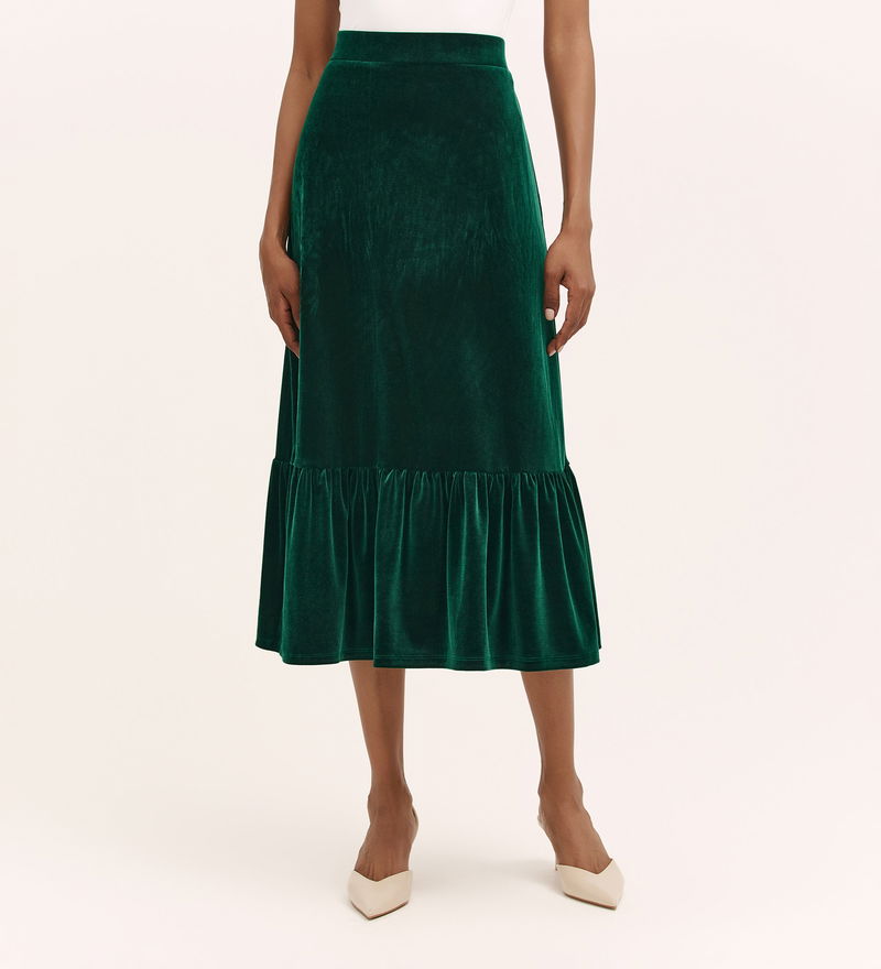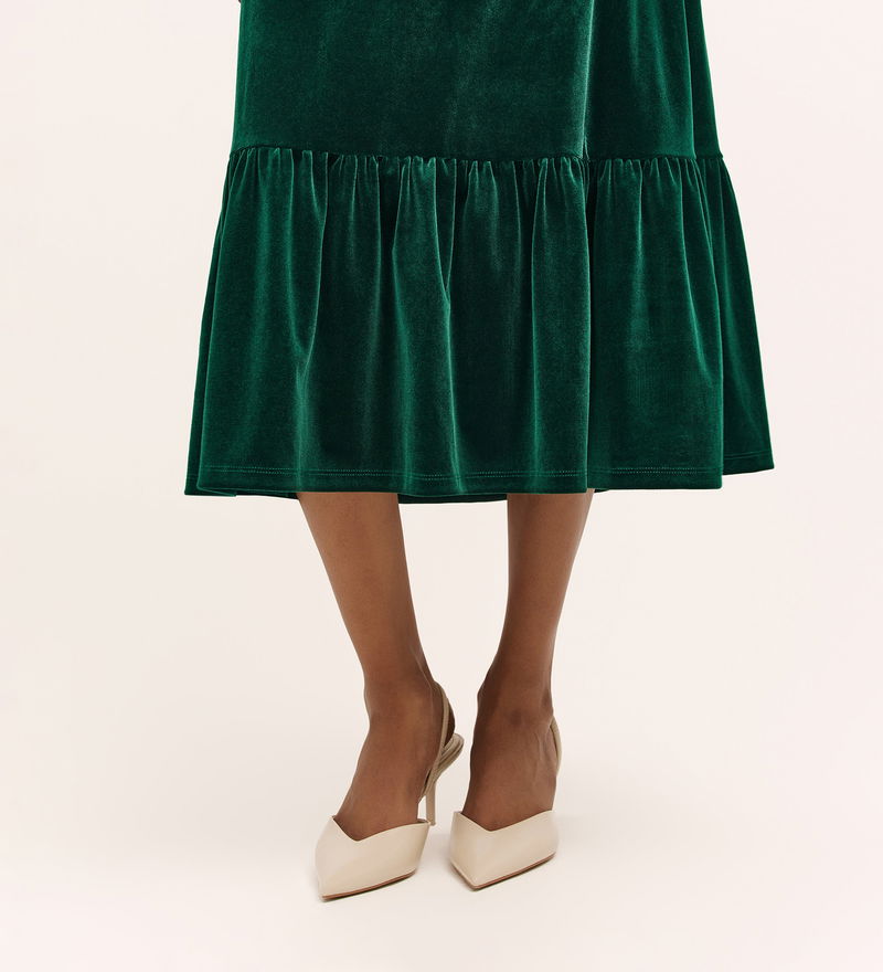 Joline is a tiered midi skirt that brings ease and elegance together in plush jersey velvet. Designed with an elasticated waistband, her softly gathered tiers create a fluid, flattering shape. Whether dressed up or styled casually, Joline offers rich texture and relaxed charm that transitions beautifully through the seasons.