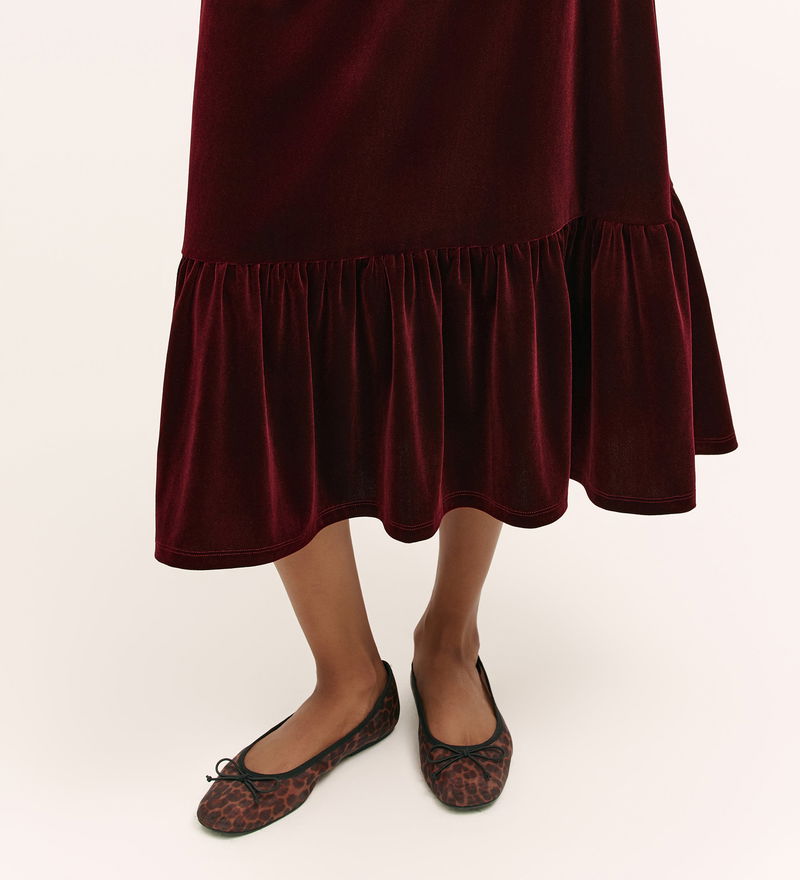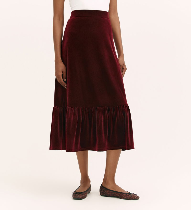 Joline is a tiered midi skirt that brings ease and elegance together in plush jersey velvet. Designed with an elasticated waistband, her softly gathered tiers create a fluid, flattering shape. Whether dressed up or styled casually, Joline offers rich texture and relaxed charm that transitions beautifully through the seasons.