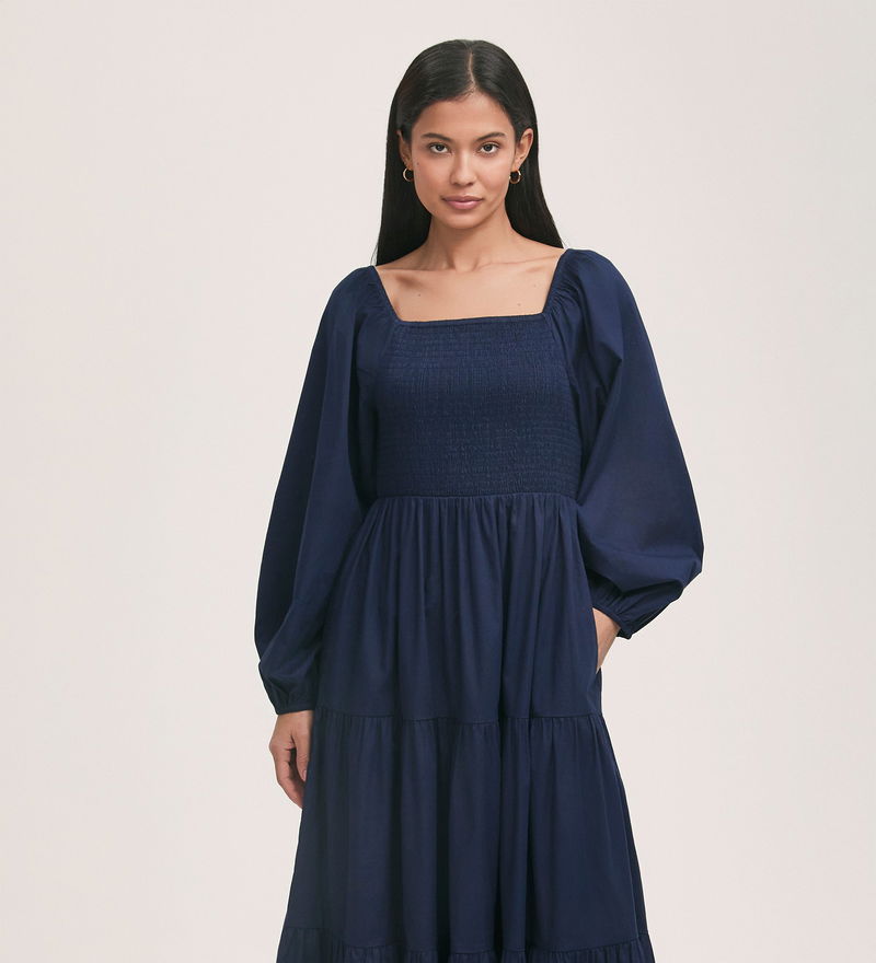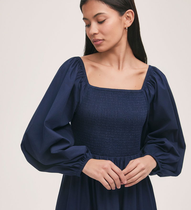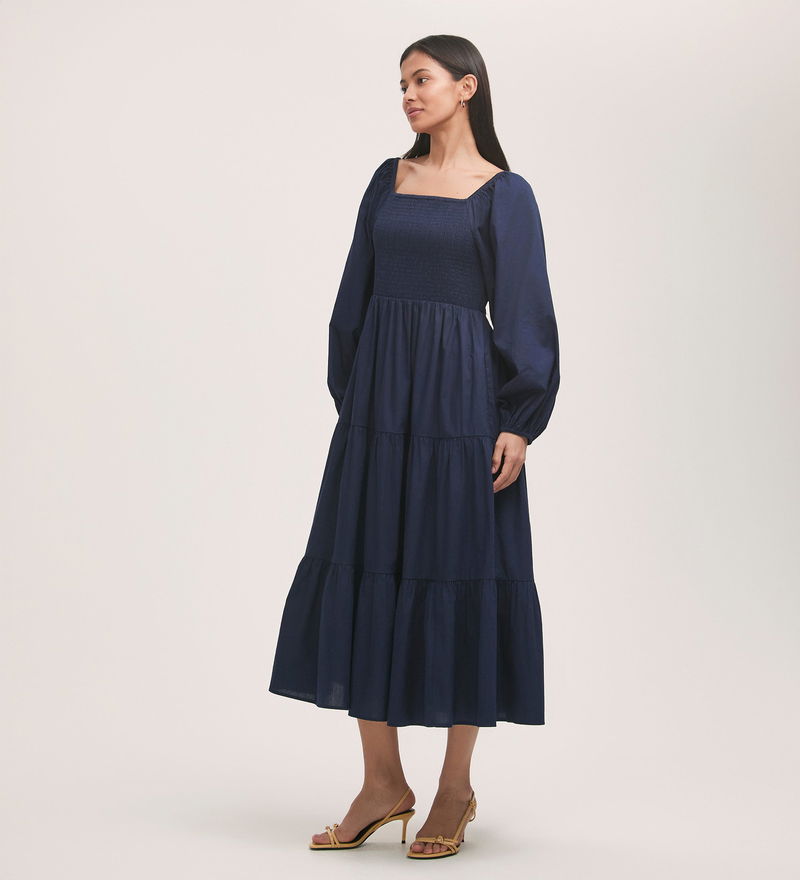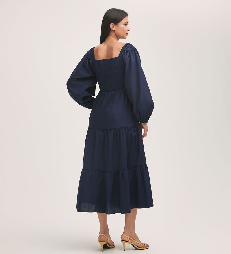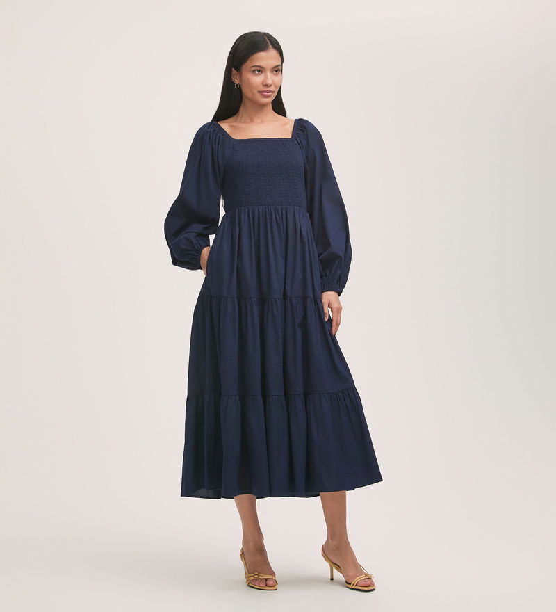 Meet Lauretta, a navy fit and flare midi dress with a figure-flattering shirred bodice. Crafted from soft-against-the-skin cotton poplin, she features a tiered skirt, square neck, long blouson sleeves with elasticated cuffs and functional side pockets.