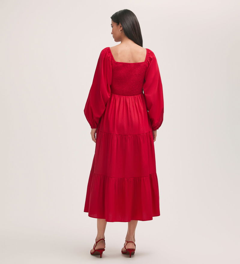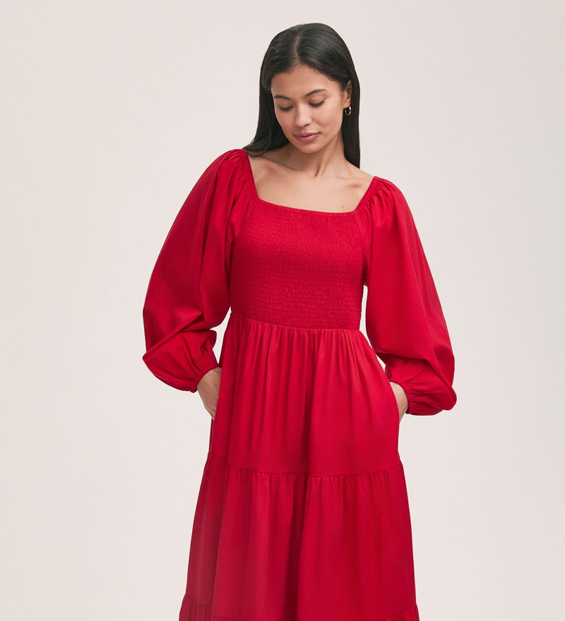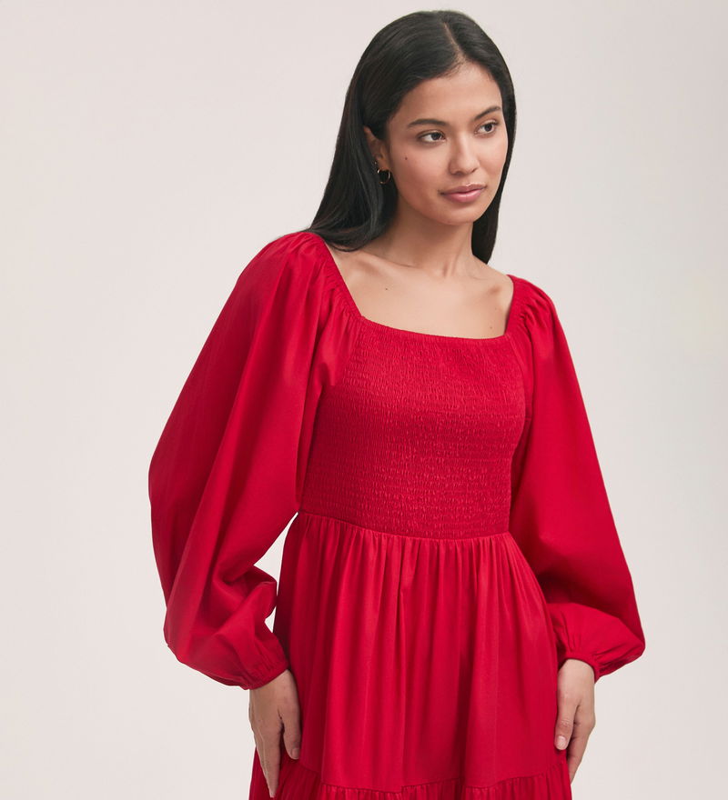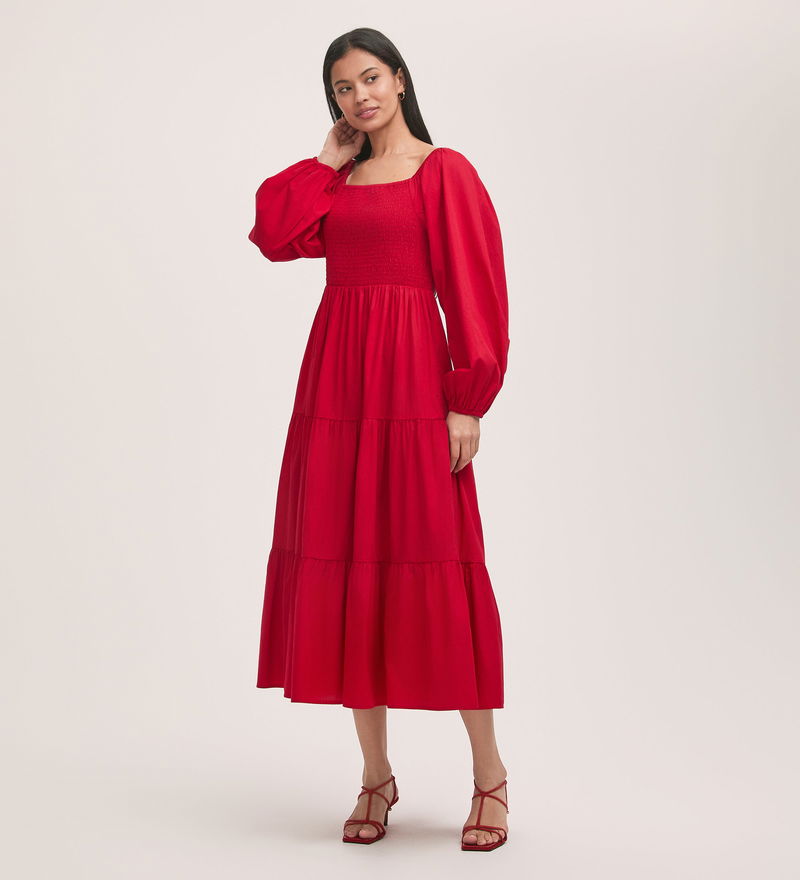 Meet Lauretta, a red fit and flare midi dress with a figure-flattering shirred bodice. Crafted from soft-against-the-skin cotton poplin, she features a tiered skirt, square neck, long blouson sleeves with elasticated cuffs and functional side pockets.